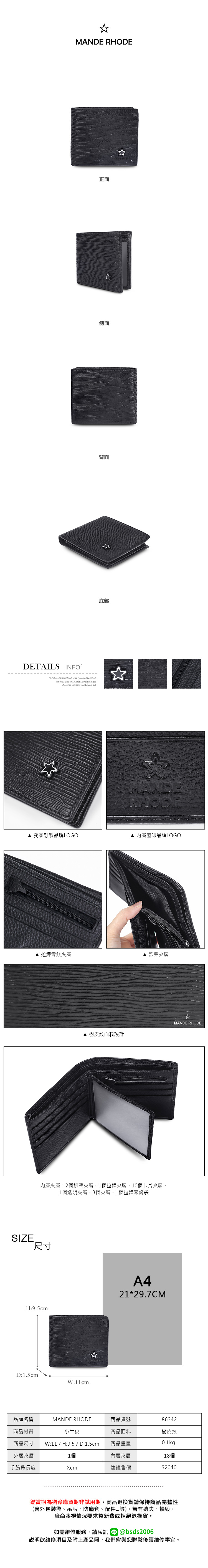MANDE RHODE - 曼德羅德 - 真皮訂製樹皮紋短夾(內有左右隔層) - 86342