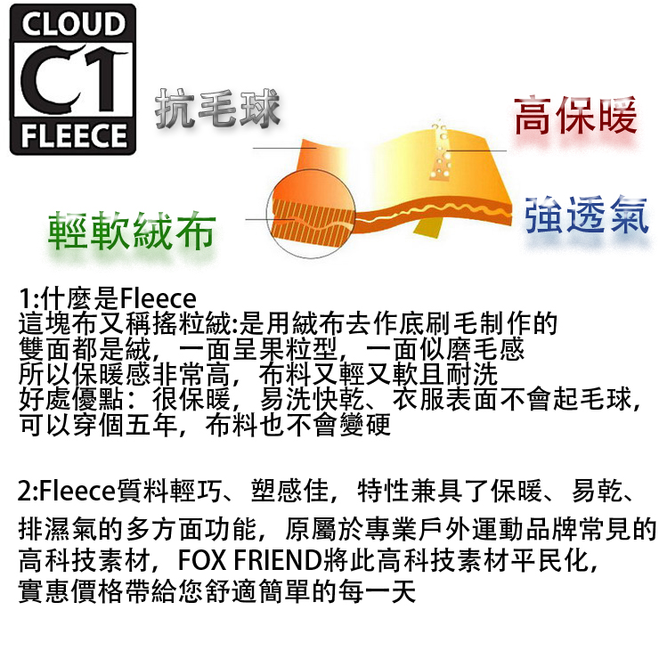 • 採用台灣刷毛布料,觸感舒適又保暖