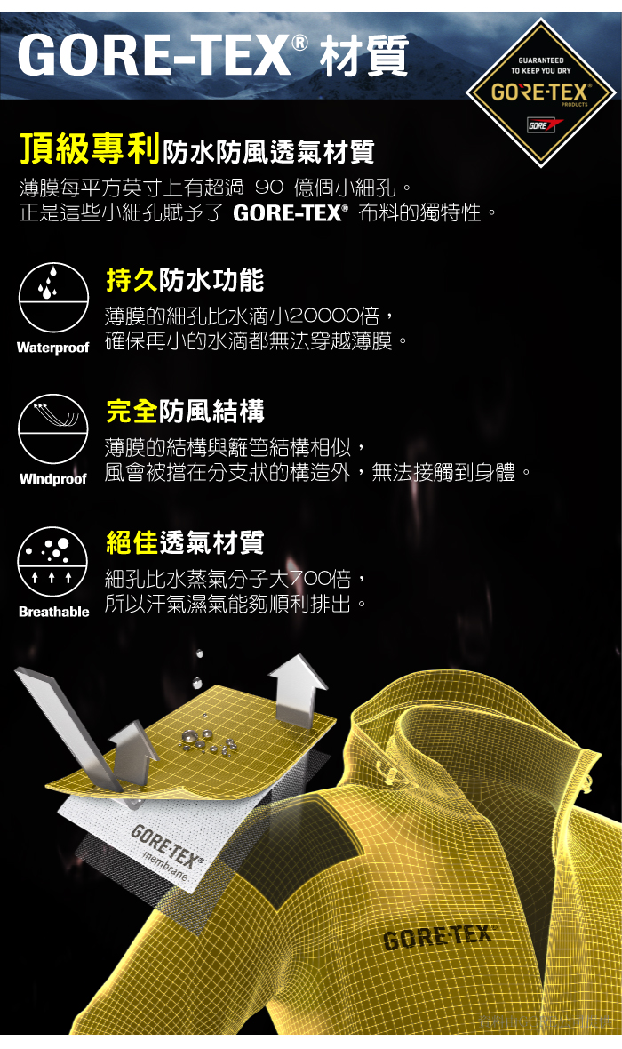 • GORE-TEX產品保證持久防水、防風、極度透氣