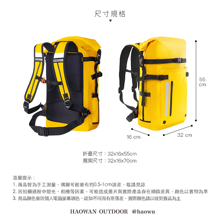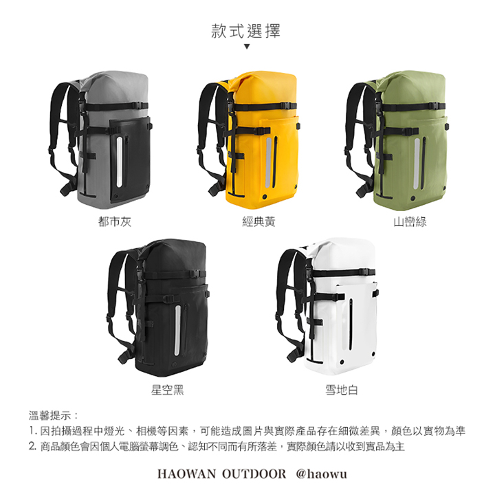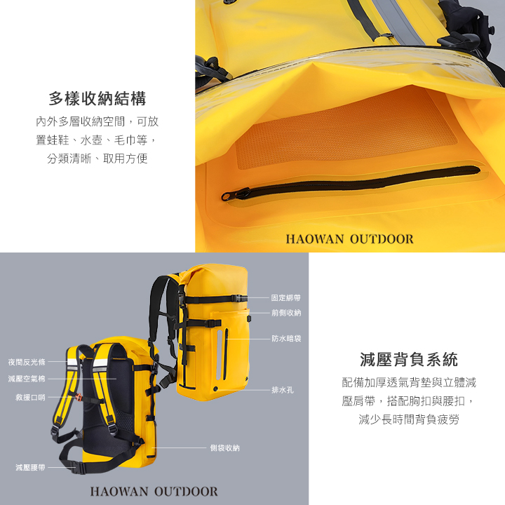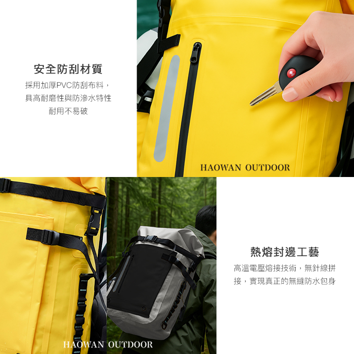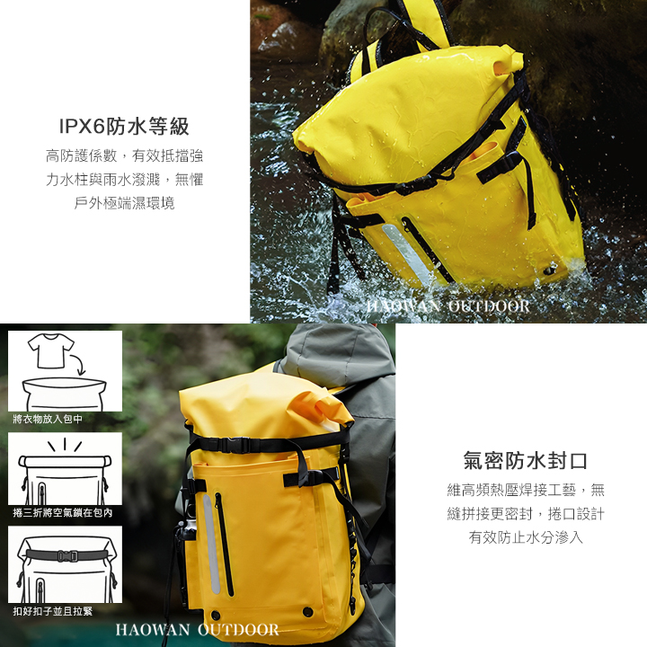 • 氣密防水封口-高頻熱壓焊接工藝,無縫拼接更密封,捲折開口設計將空氣壓力所在包內有效防止水分滲入。