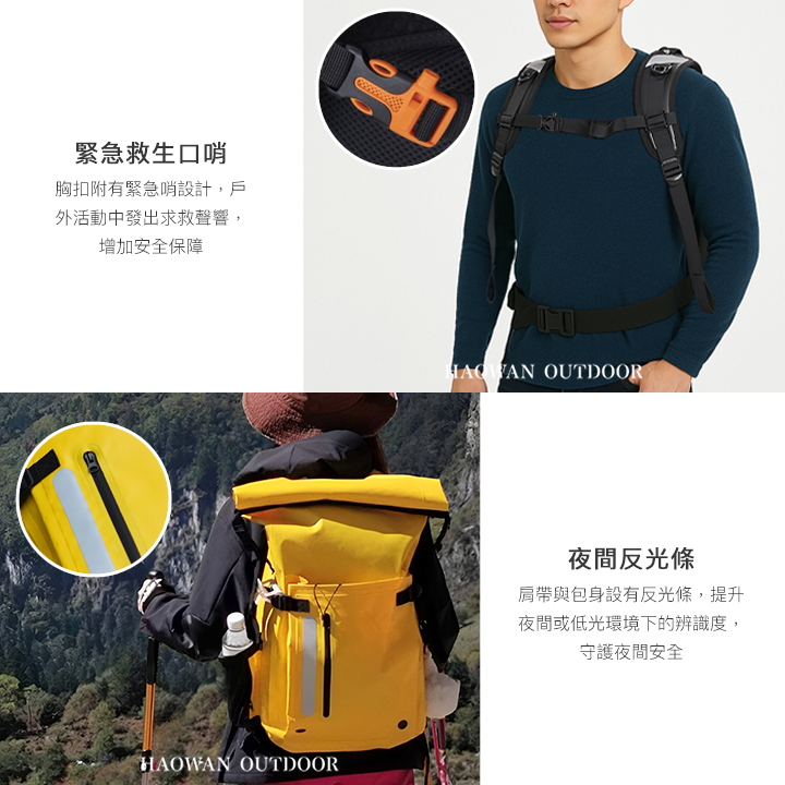 • 緊急救生口哨-胸扣附有緊急哨設計,戶外活動中發出求救聲響,增加安全保障。