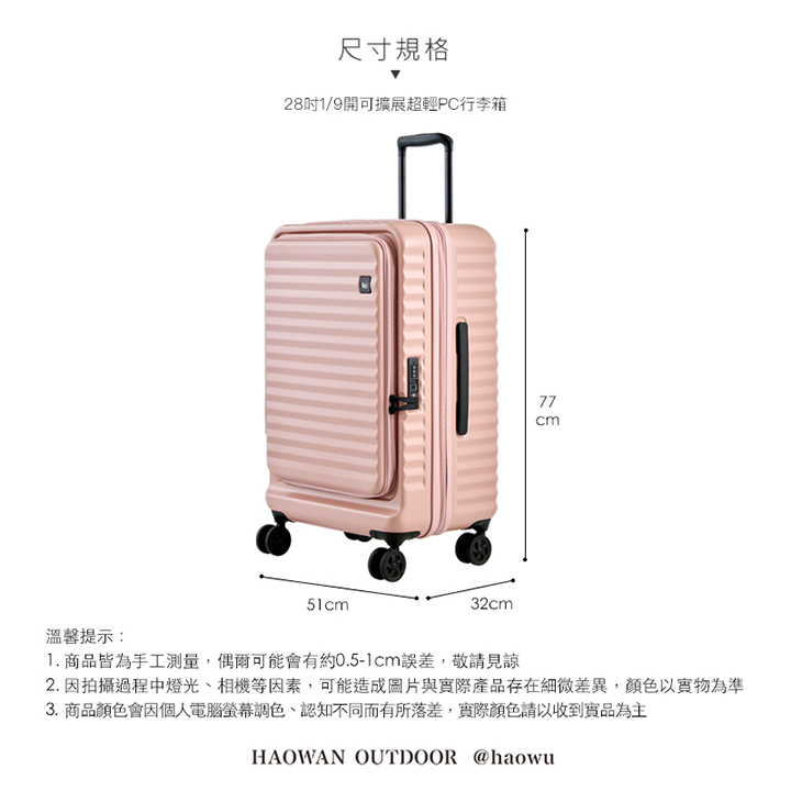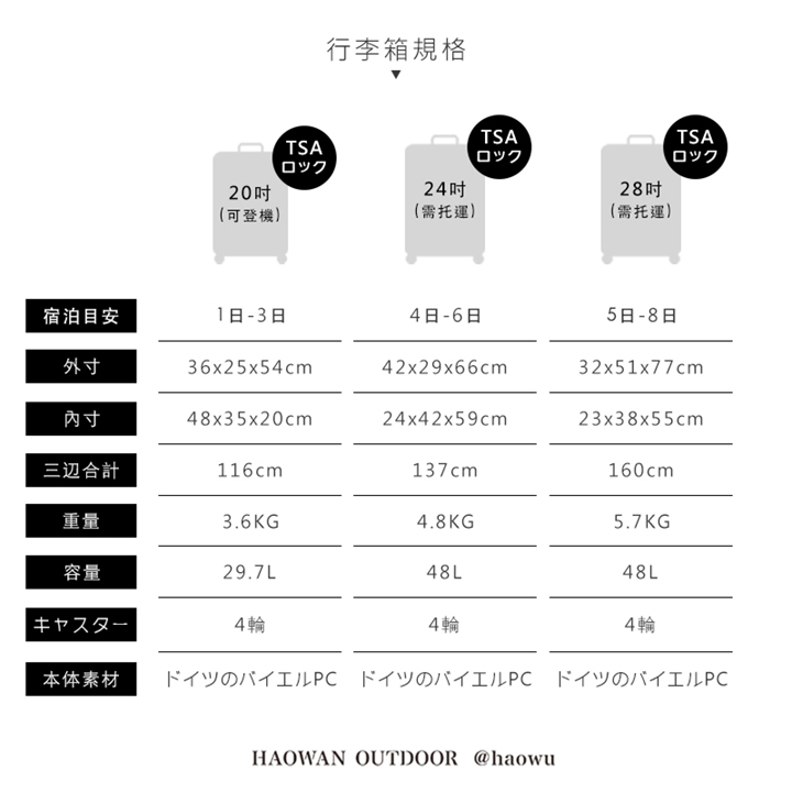 拉桿:鋁合金/外殼:純PC/輪子:hinomoto靜音輪/內裏:聚酯纖維