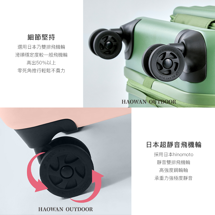 • 日本超靜音飛機輪-採用日本hinomoto靜音雙排飛機輪,高強度鋼輪軸、承重力強、減震降噪,提供順暢穩定的使用體驗