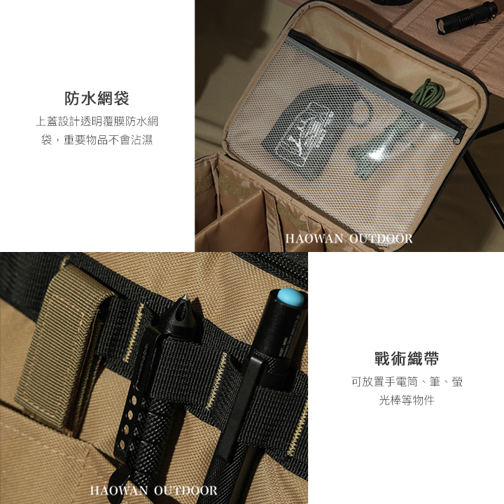 • 戰術織帶-可放置手電筒、筆、螢光棒等物件