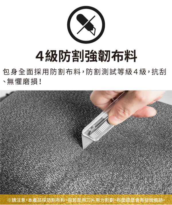 ※ 請注意,本產品採防割布料,但若是用刀片用力割劃,布面還是會有些微痕跡。