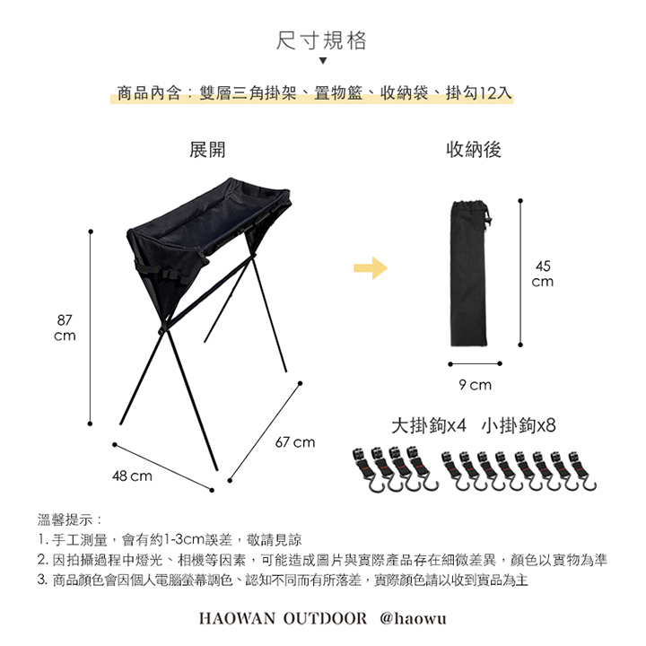 黑色單層三角掛架、收納袋、置物籃、掛鉤x12