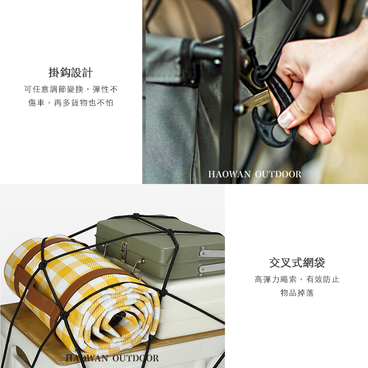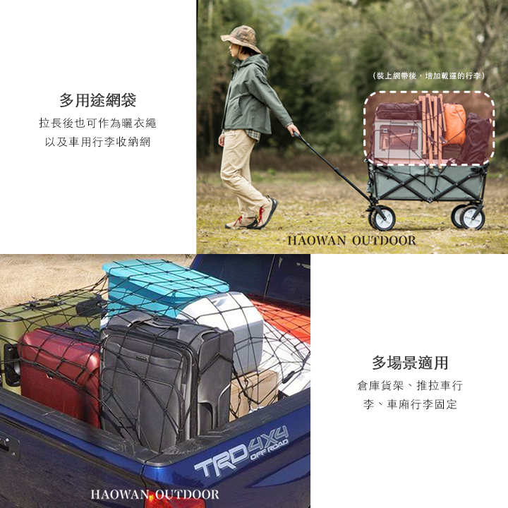 • 多用途網帶- 可以增加推拉車載運件數,拉長後也可作為曬衣繩,以及車用行李收納網