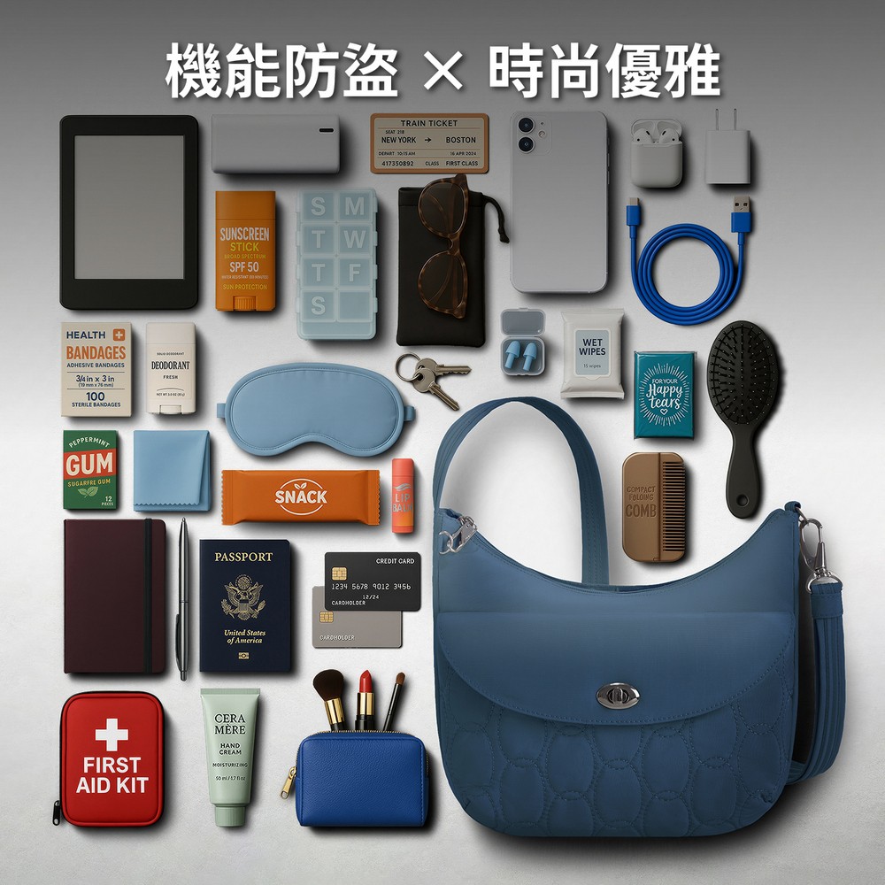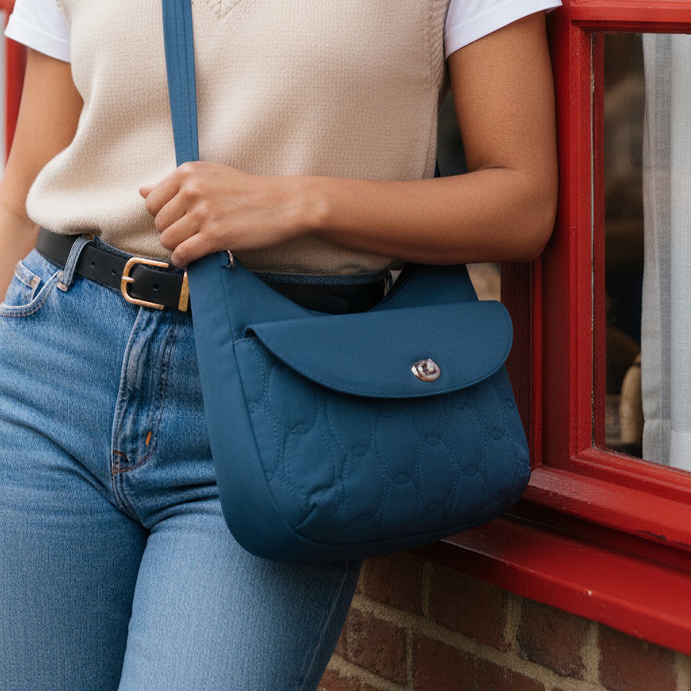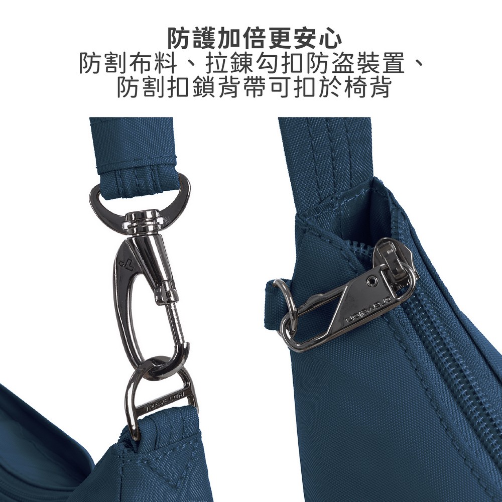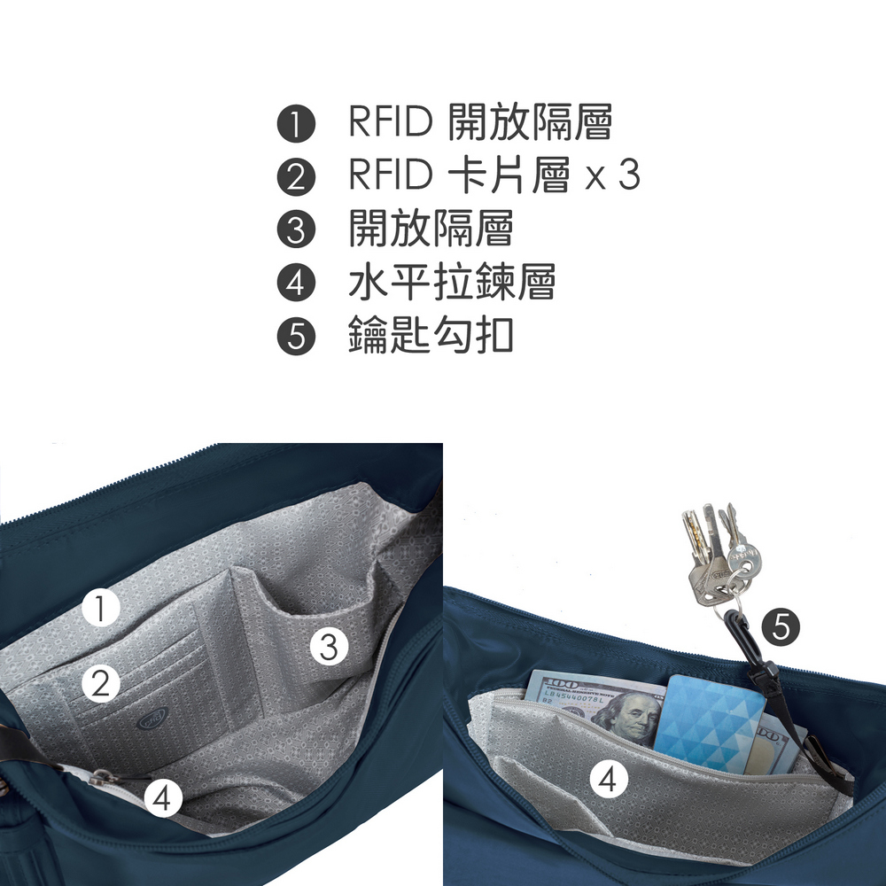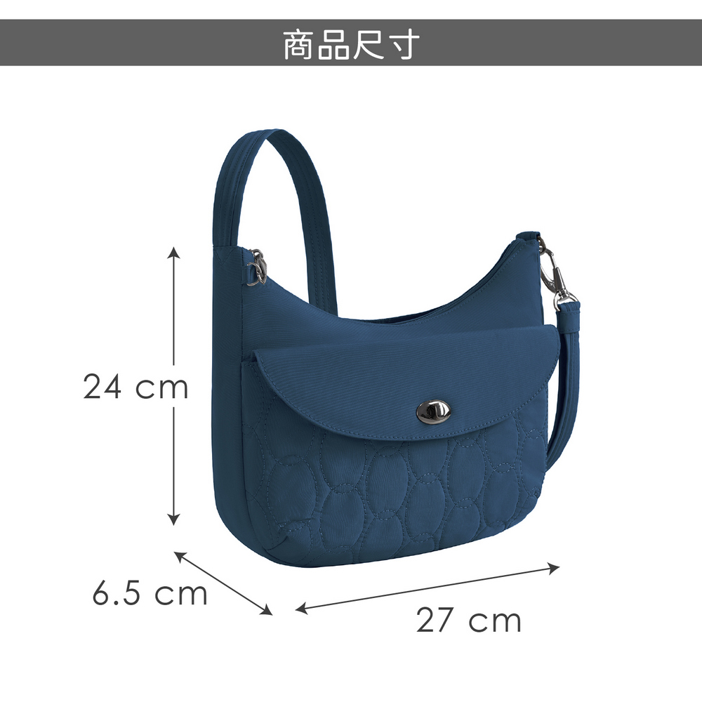 美國 TRAVELON - Runways 3層防盜斜背旋鈕彎月包(海軍藍) / RFID防盜包 斜背包 側背包 防割防搶