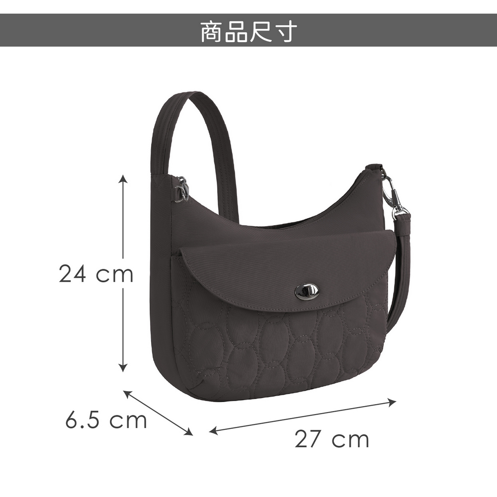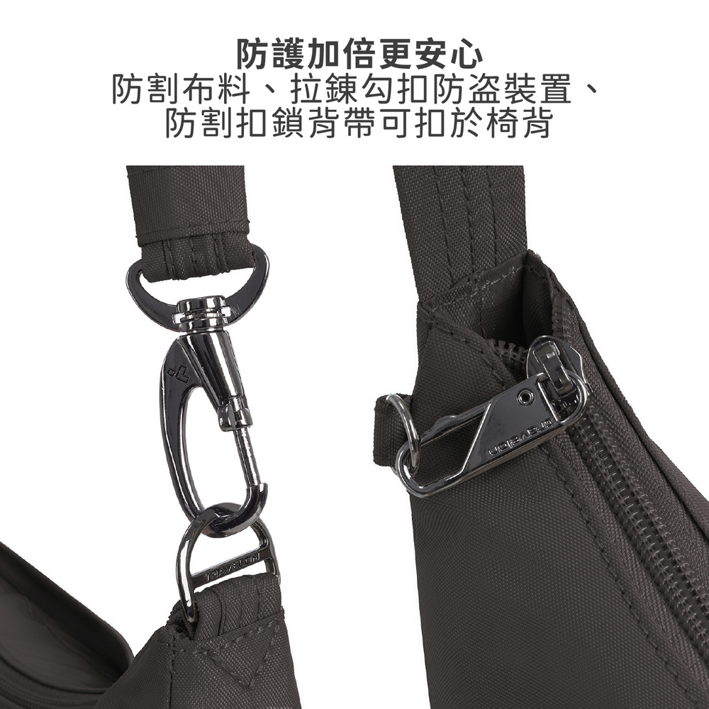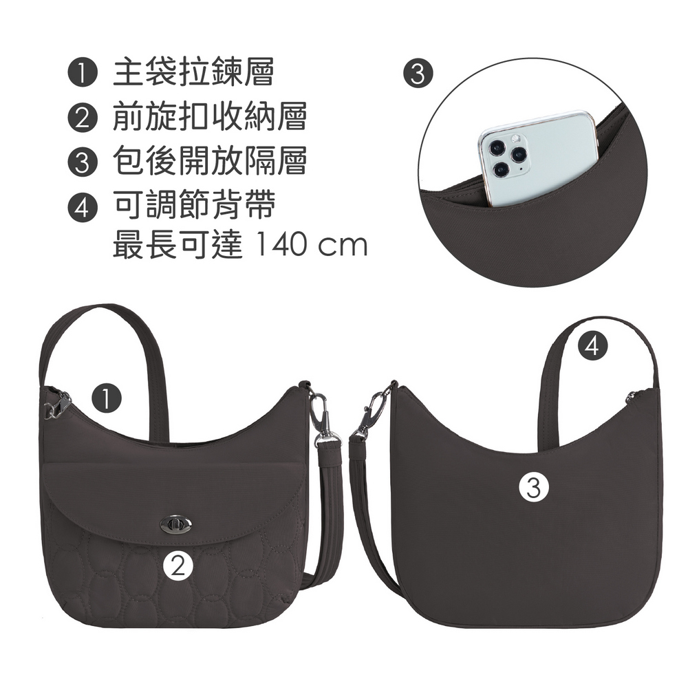 美國 TRAVELON - Runways 3層防盜斜背旋鈕彎月包(月影灰) / RFID防盜包 斜背包 側背包 防割防搶