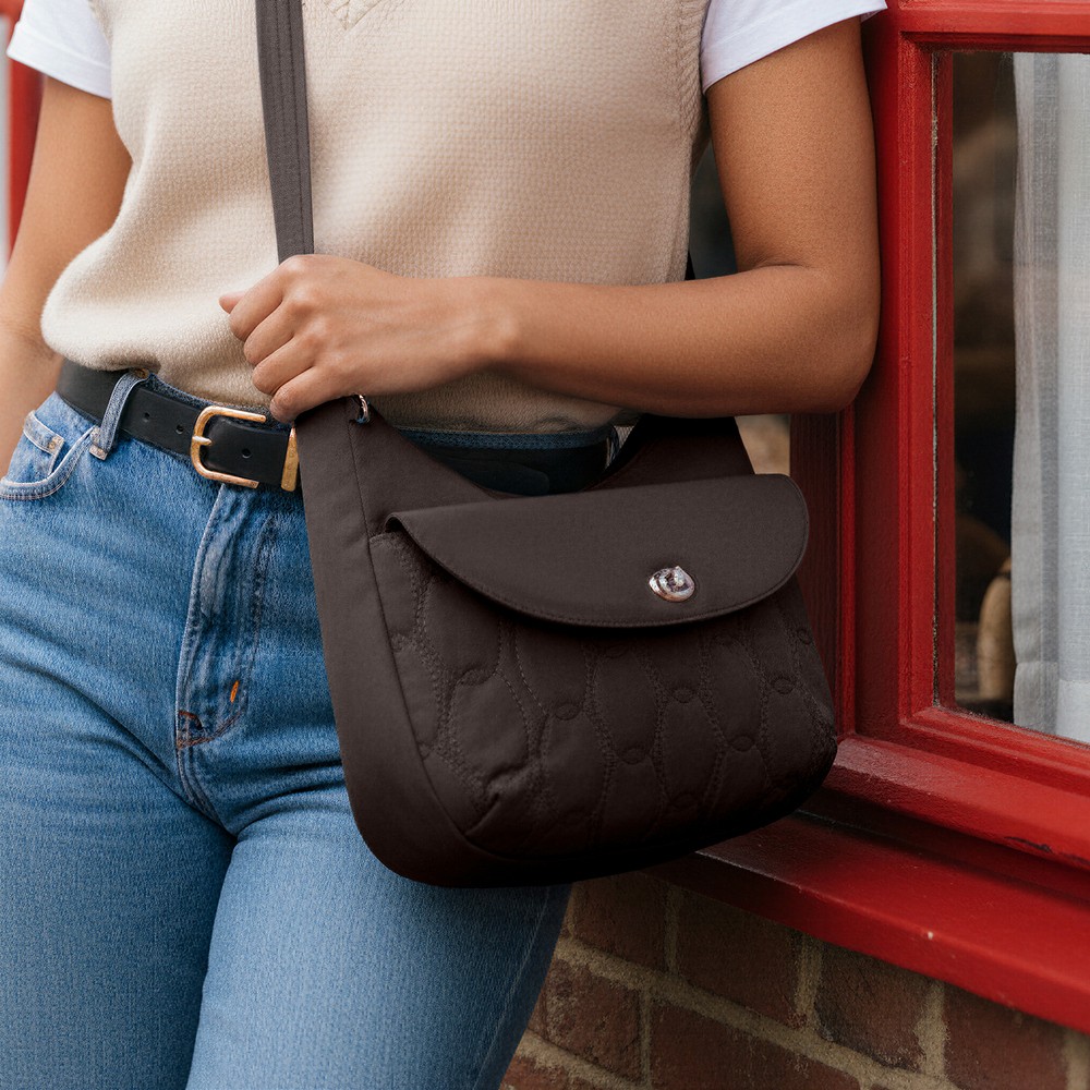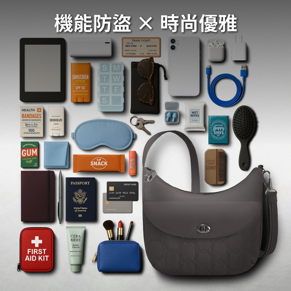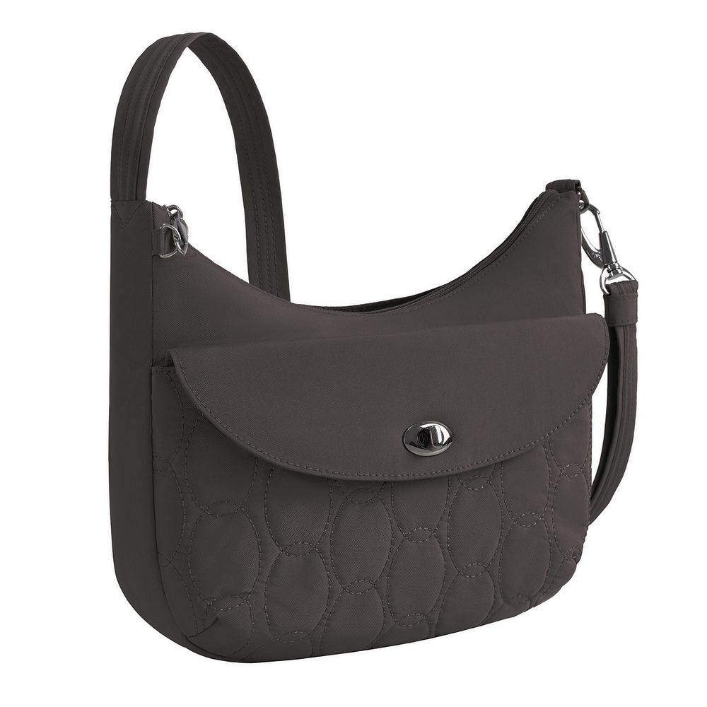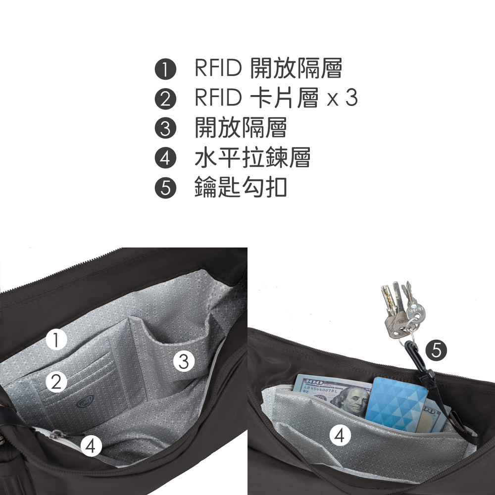 美國 TRAVELON - Runways 3層防盜斜背旋鈕彎月包(月影灰) / RFID防盜包 斜背包 側背包 防割防搶
