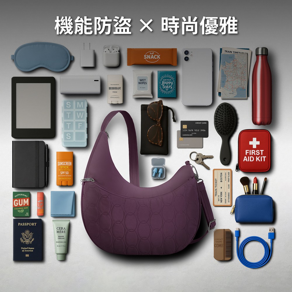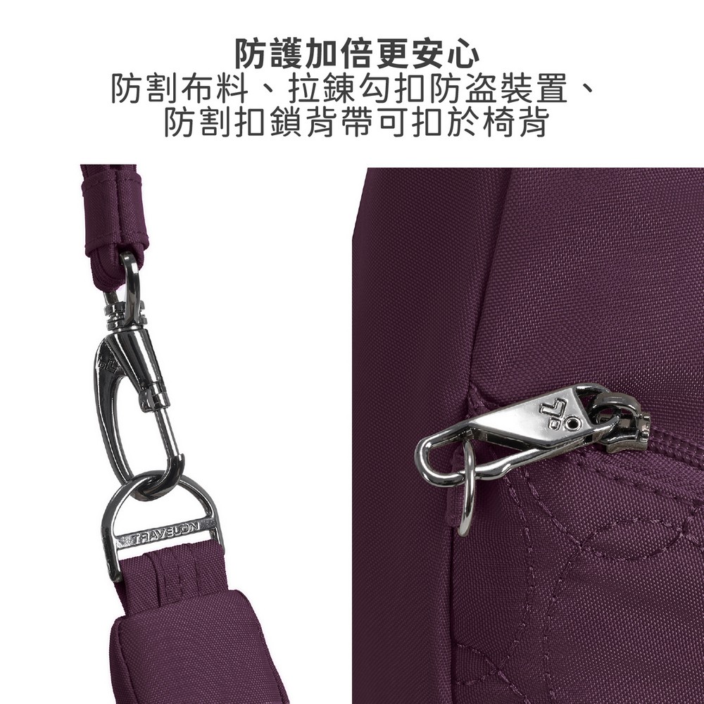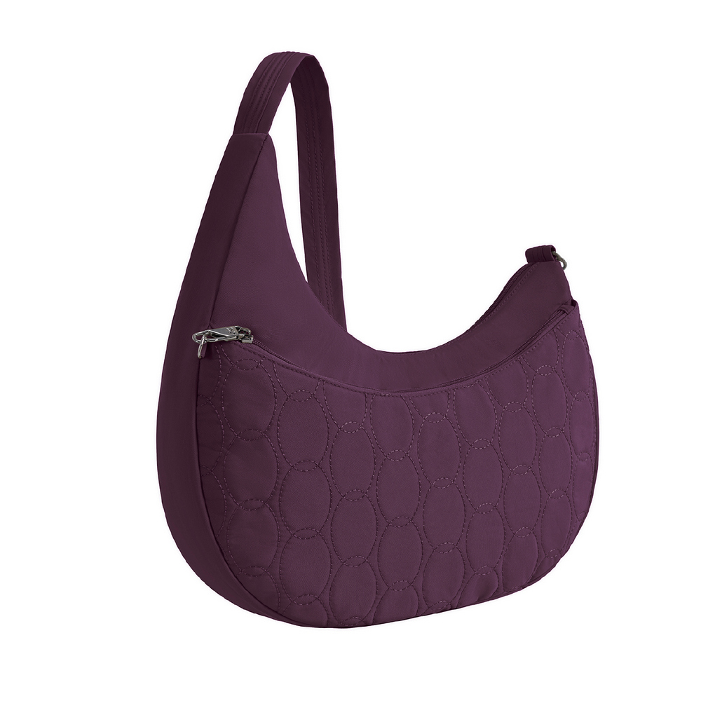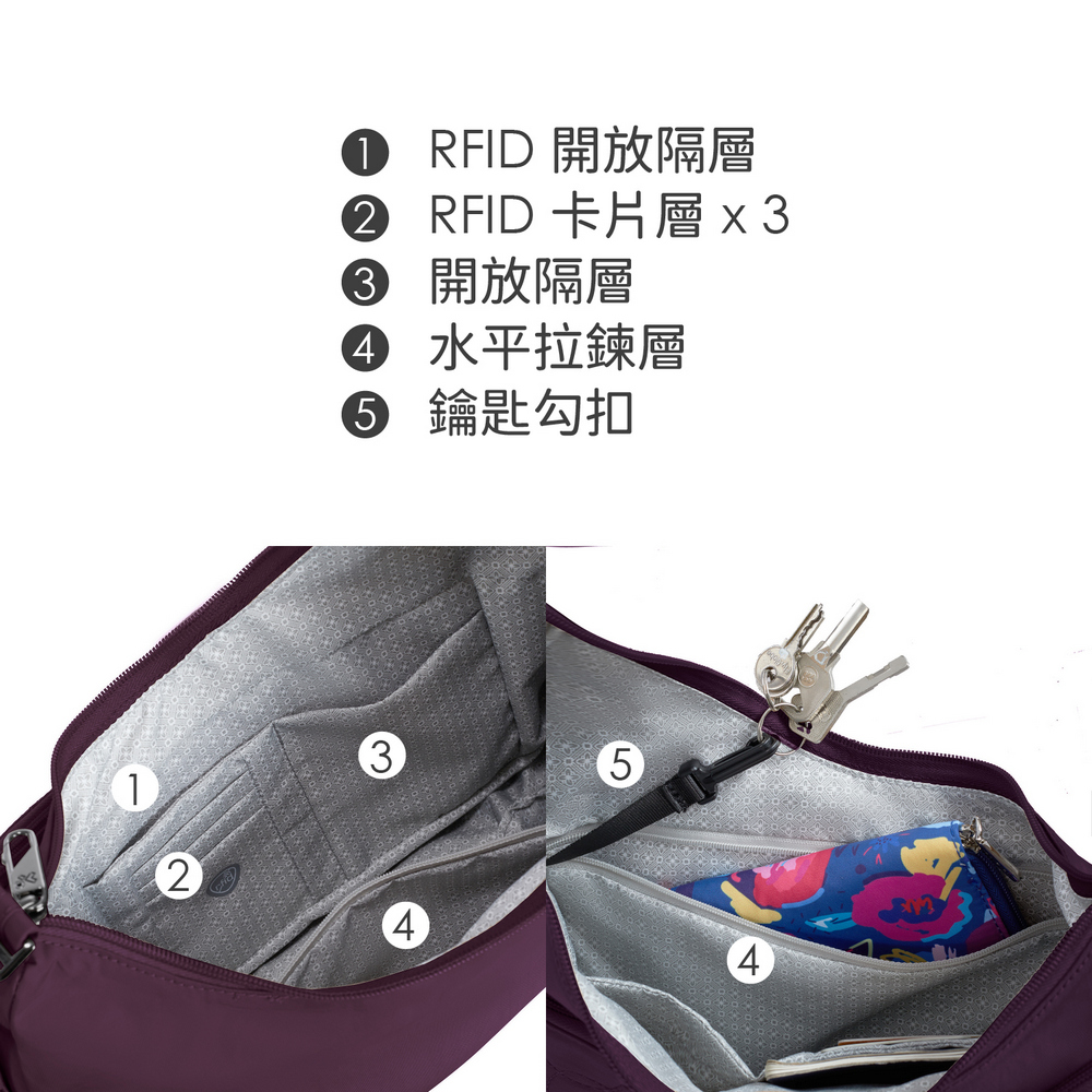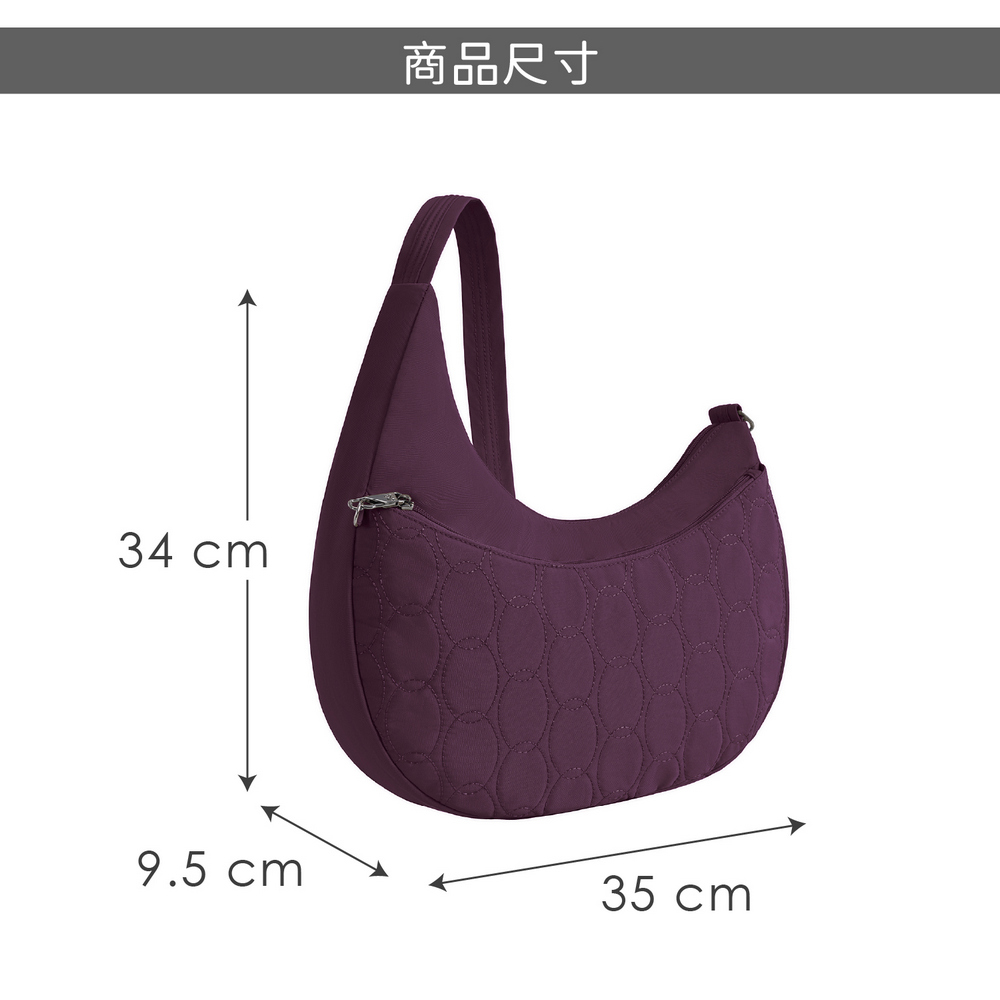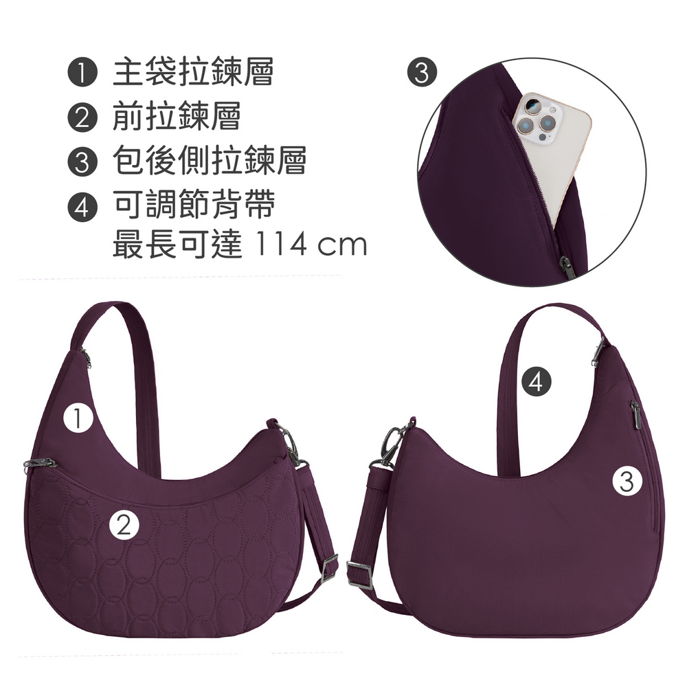 美國 TRAVELON - Runways 3層防盜斜背彎月包(黑莓紫) / RFID防盜包 斜背包 側背包 防割防搶