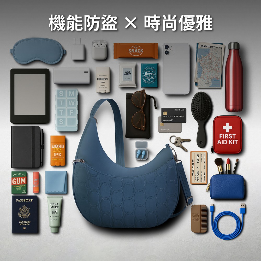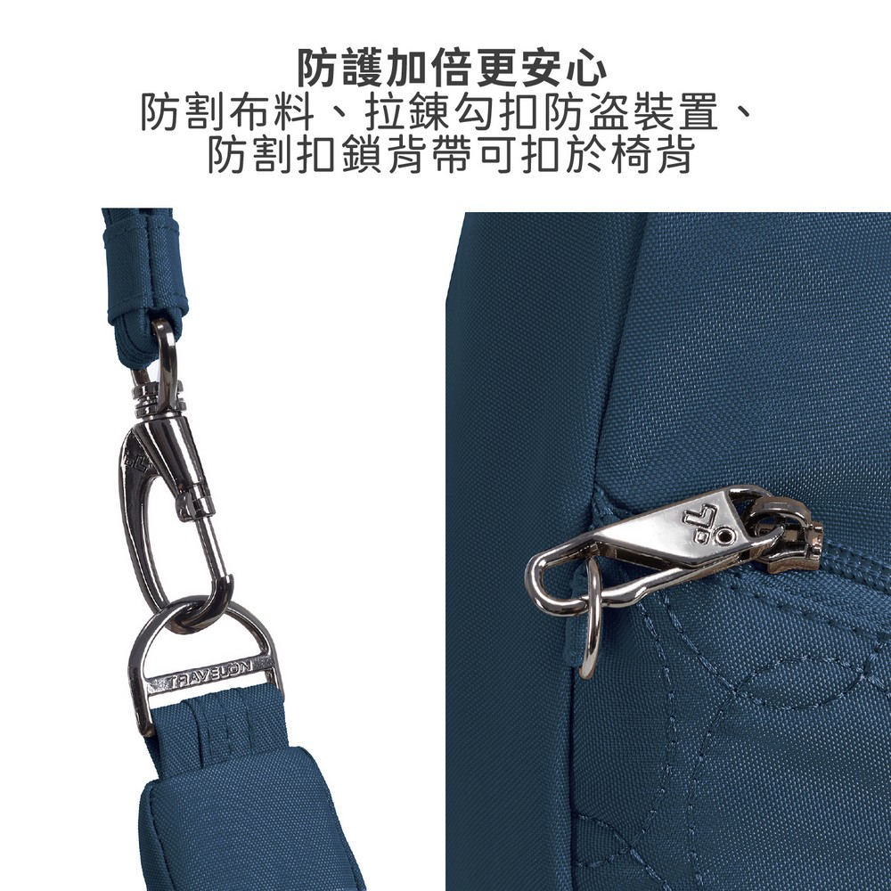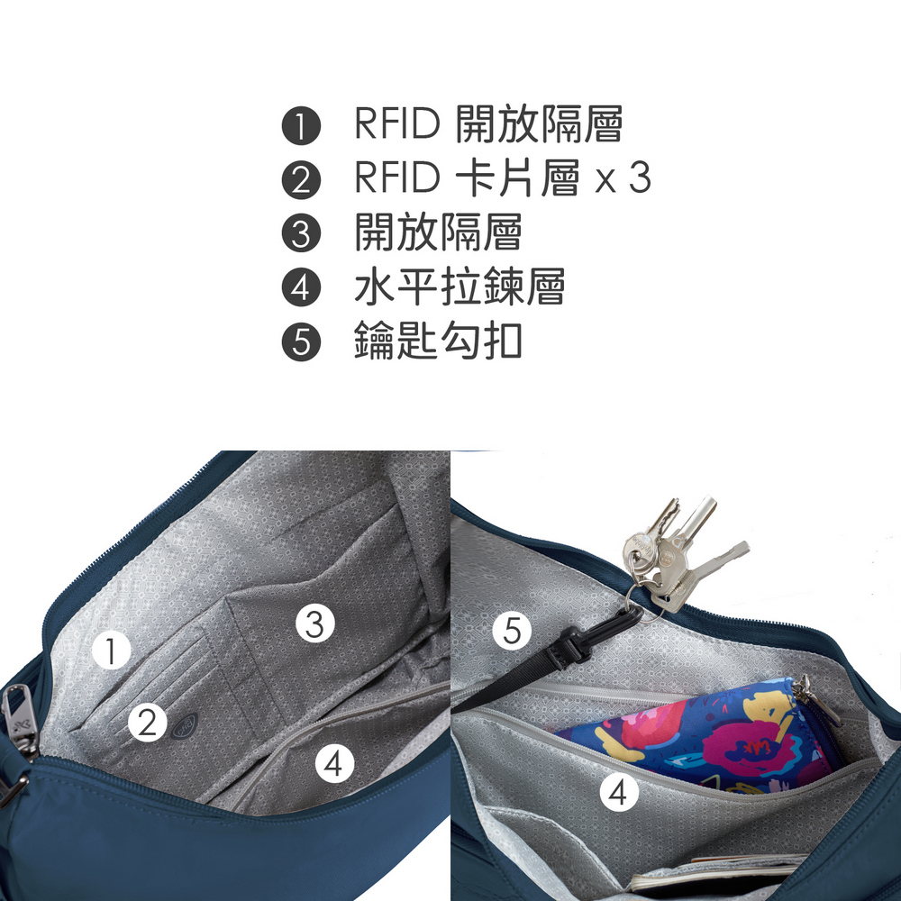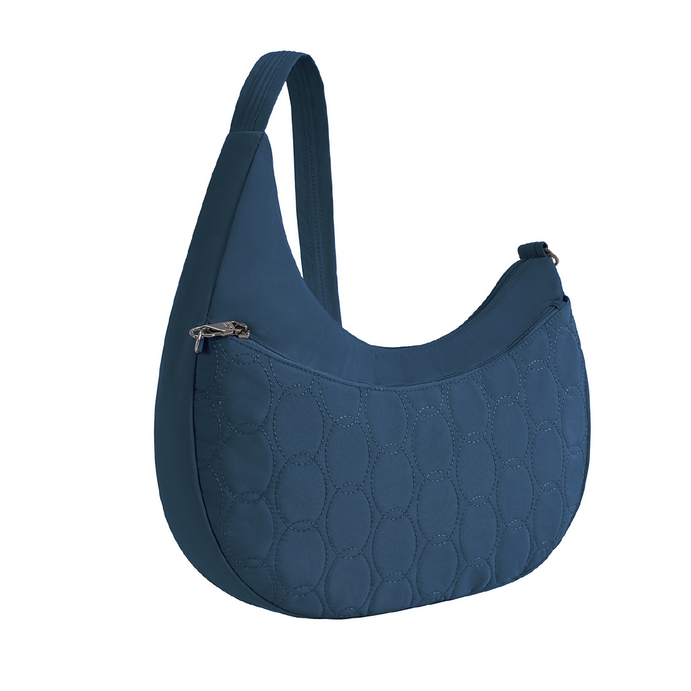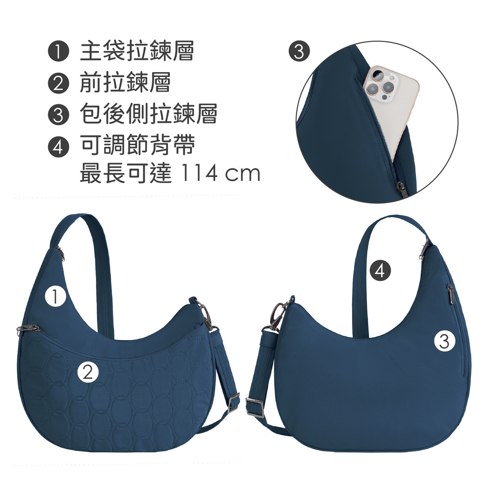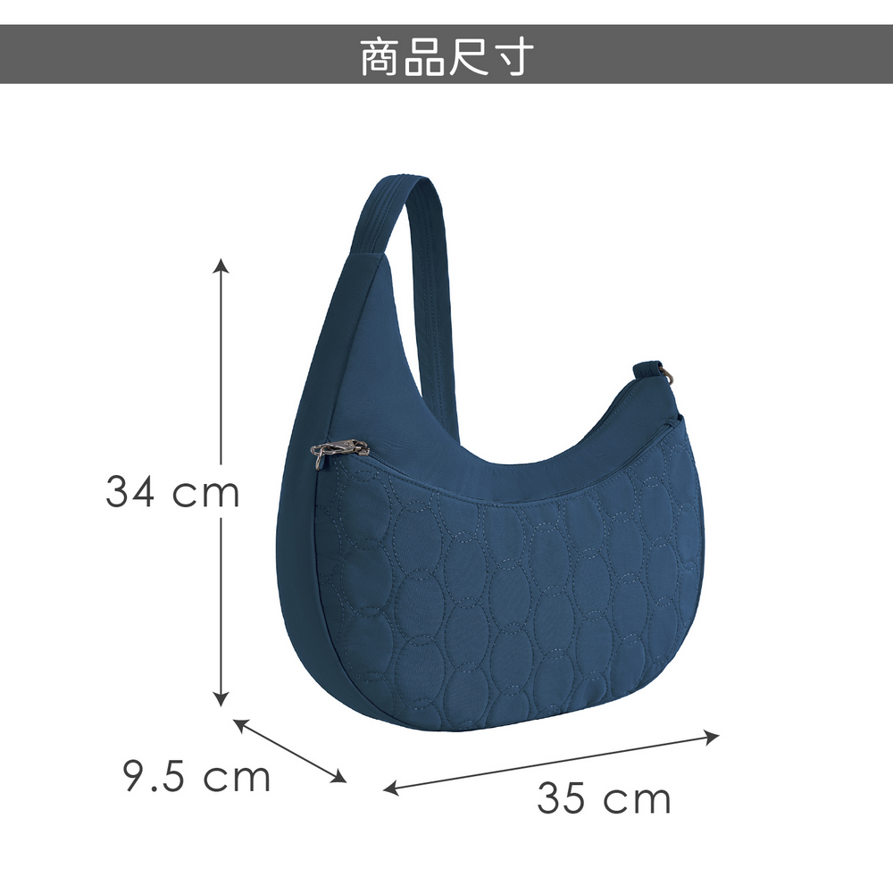美國 TRAVELON - Runways 3層防盜斜背彎月包(海軍藍) / RFID防盜包 斜背包 側背包 防割防搶