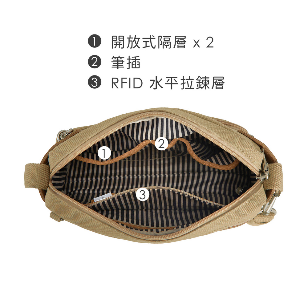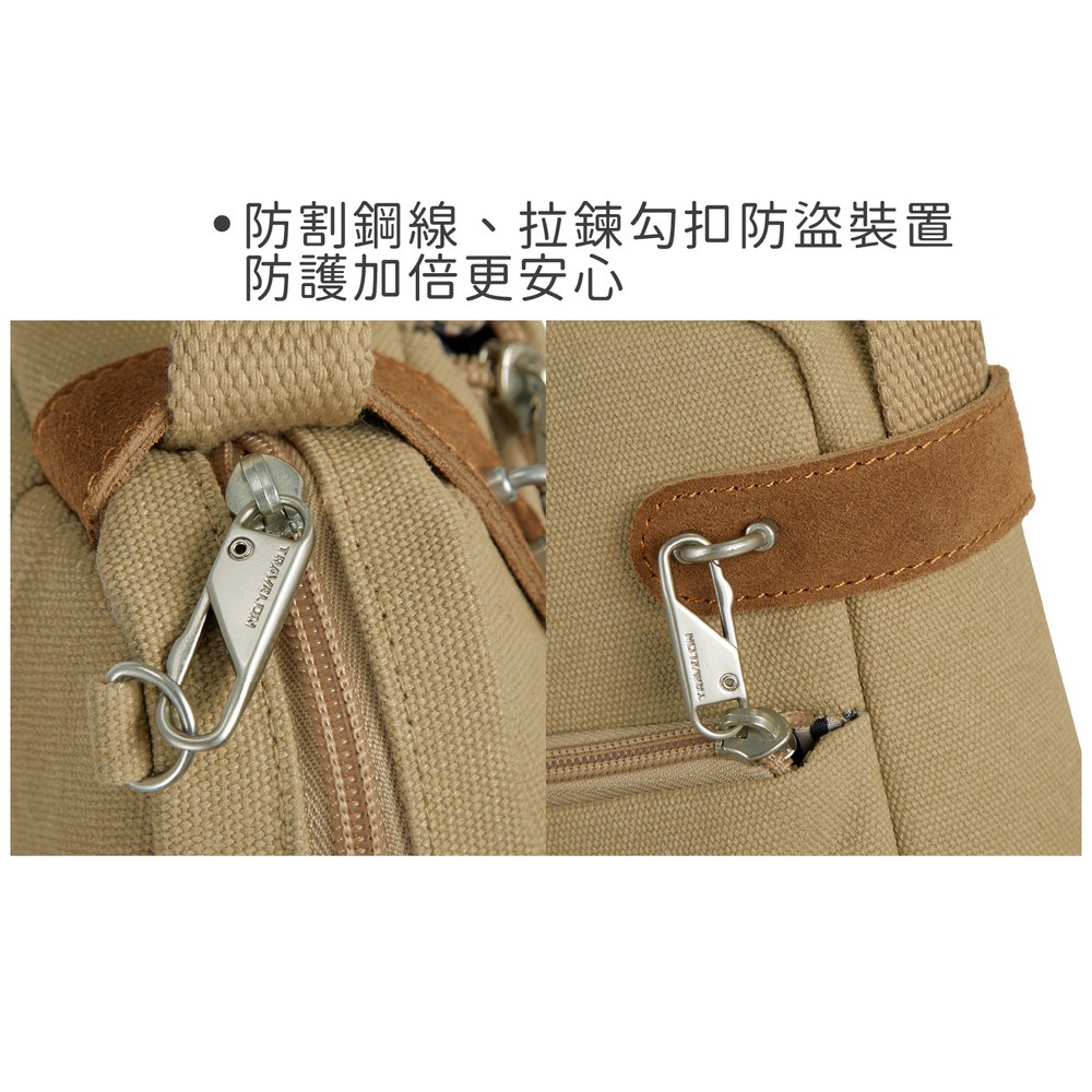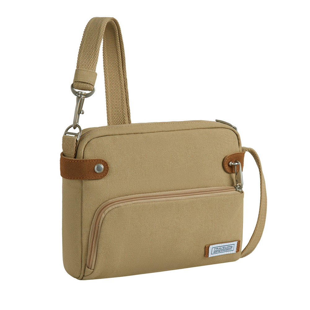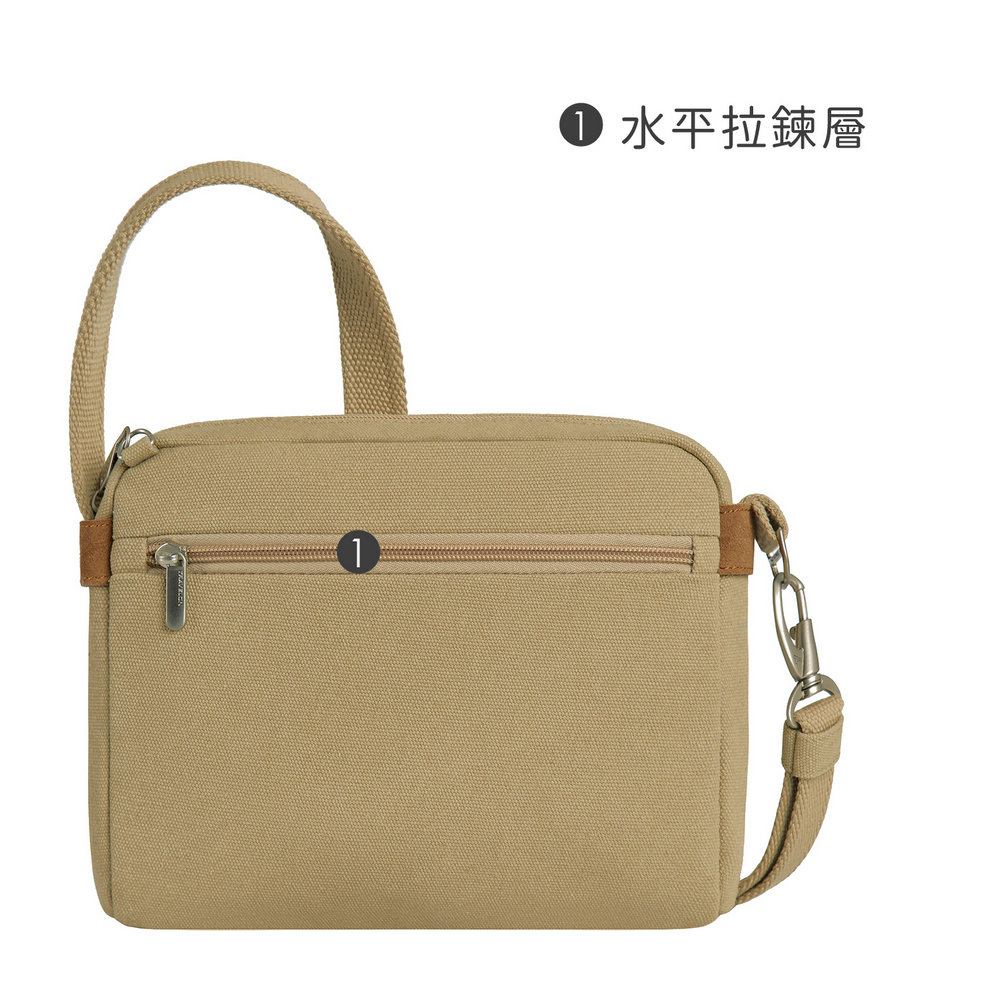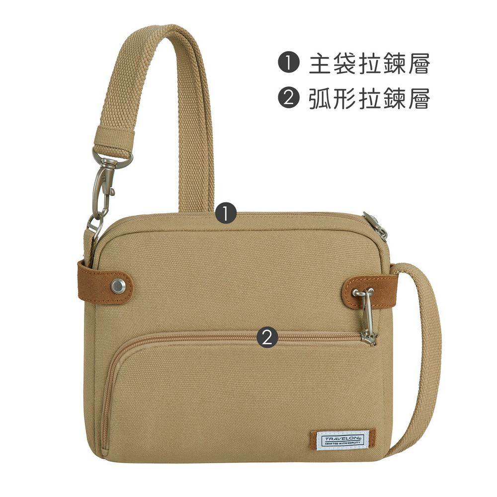美國 TRAVELON - Heritage帆布3層弧型防盜斜背包(牛仔沙) / 側背包 斜肩包 小包 背帶包 防割防搶