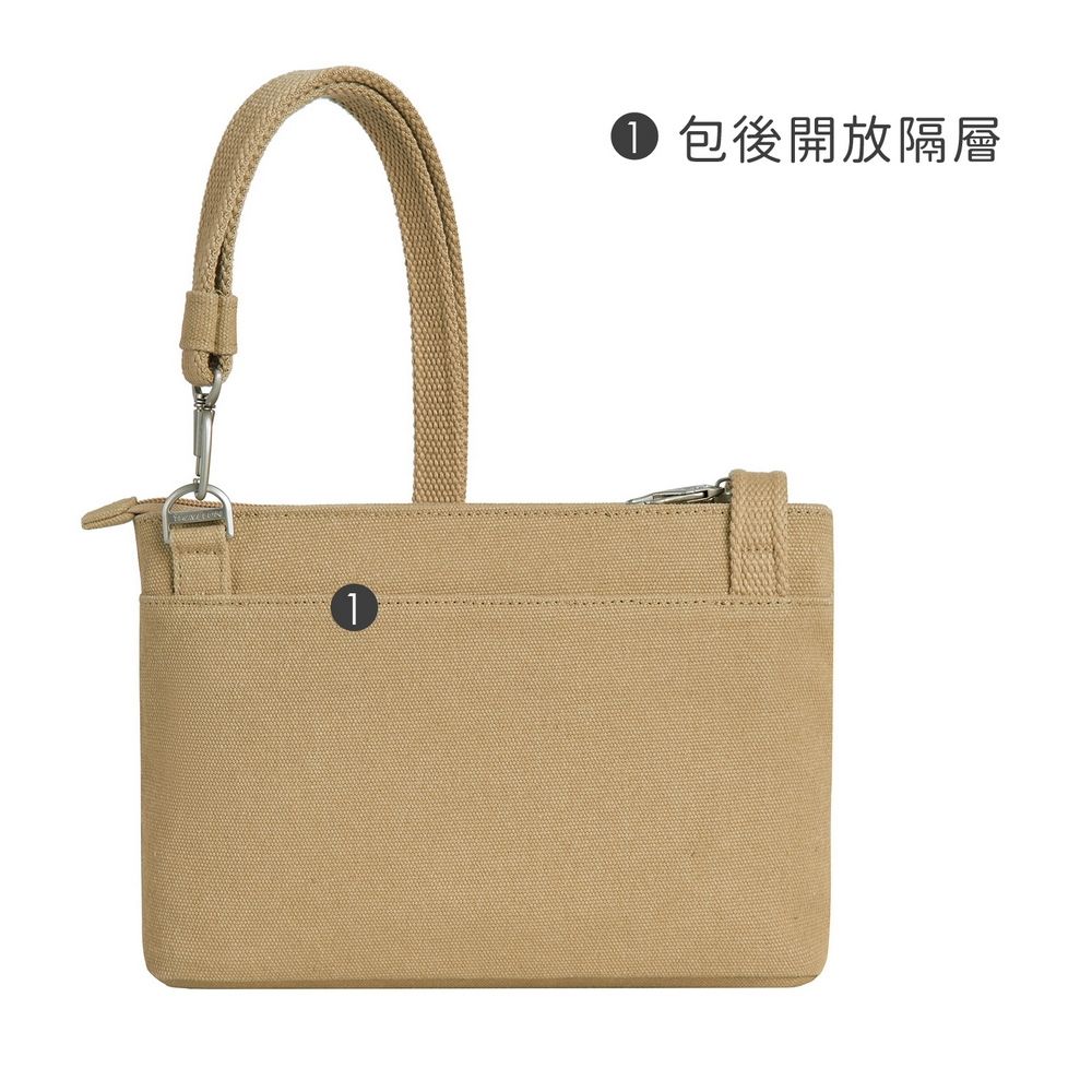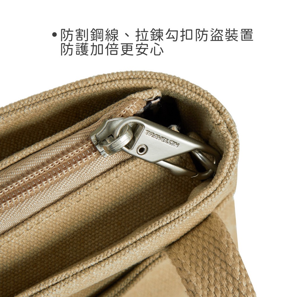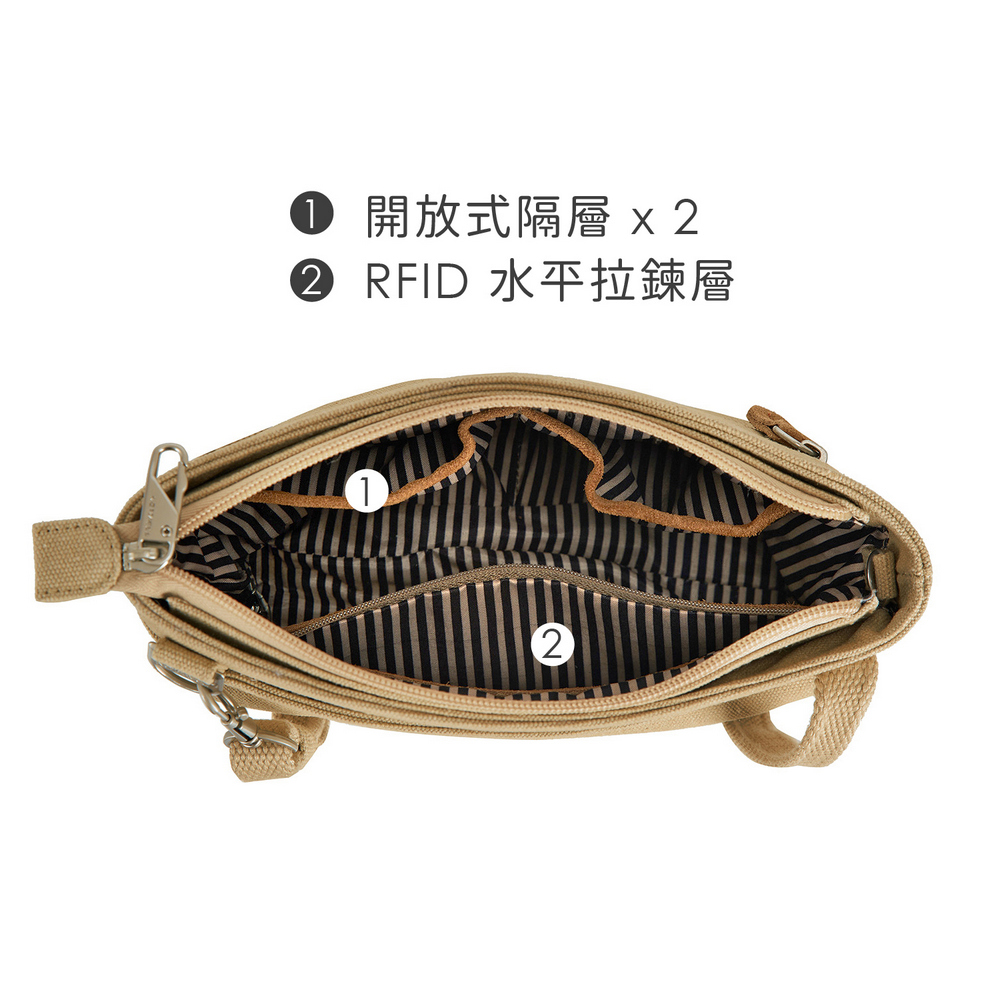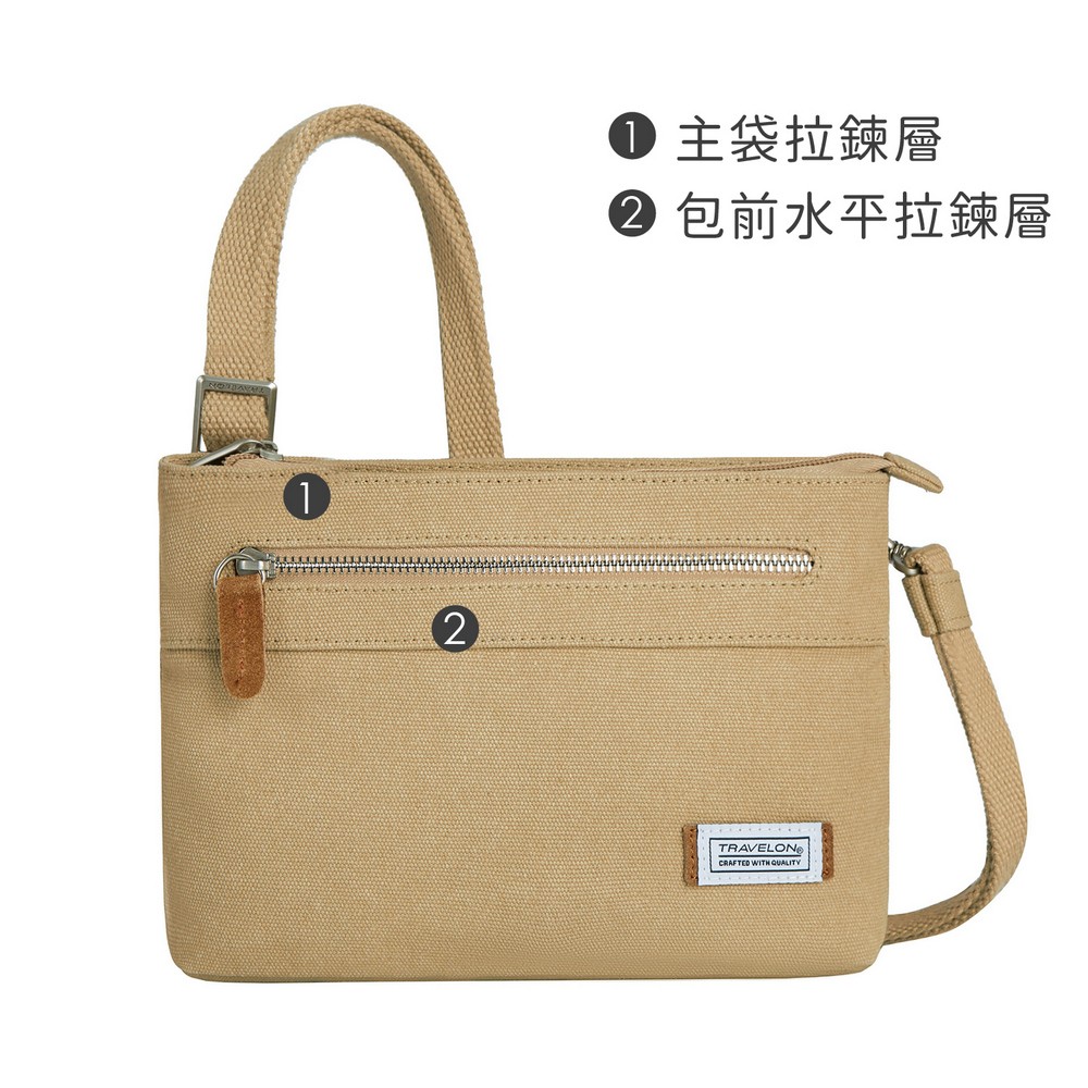 美國 TRAVELON - Heritage帆布3層防盜斜背包(牛仔沙) / 側背包 斜肩包 小包 背帶包 防割防搶