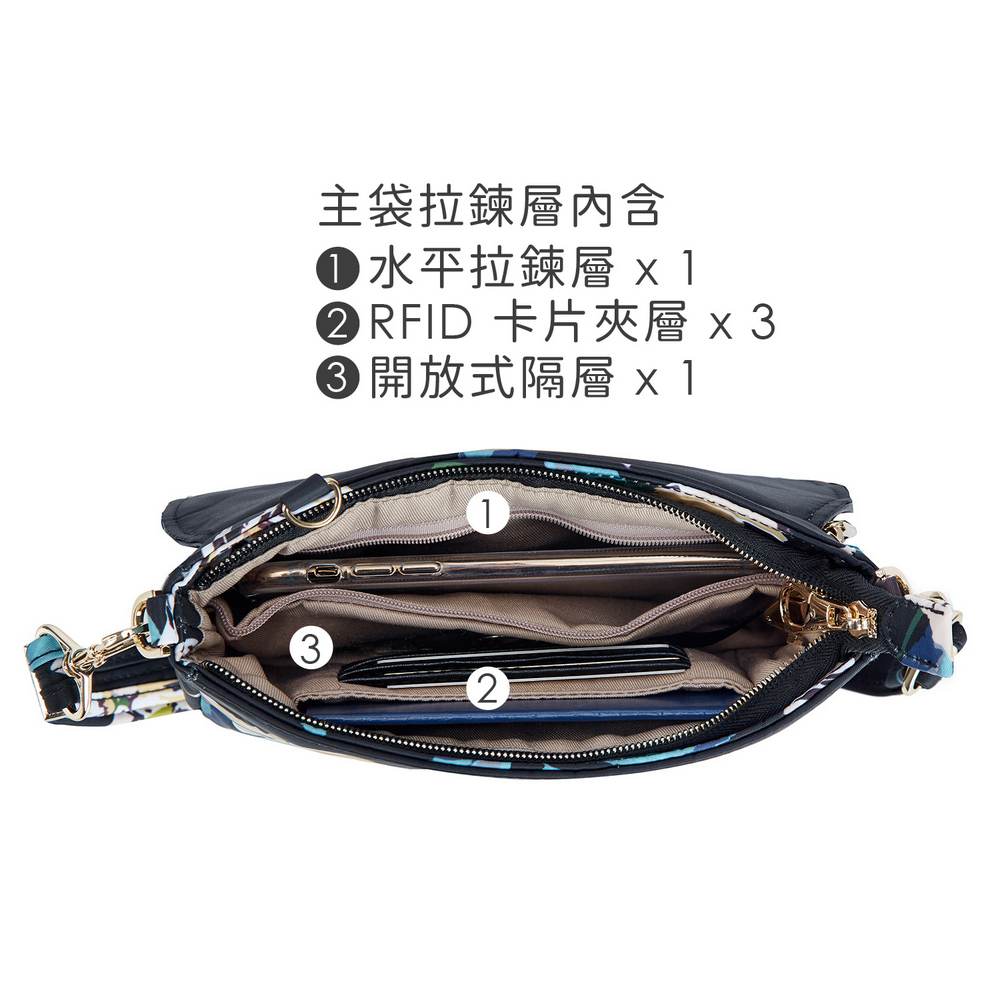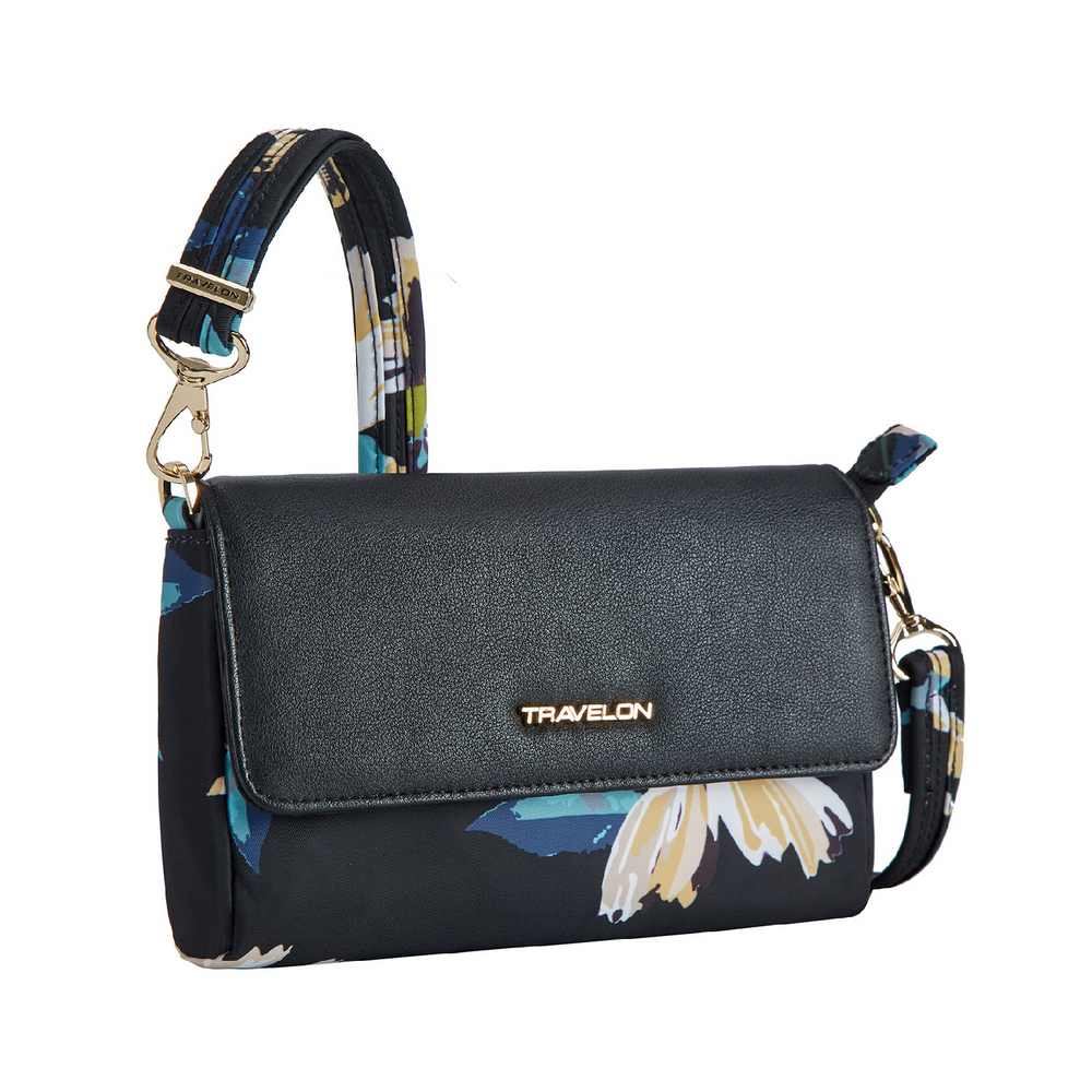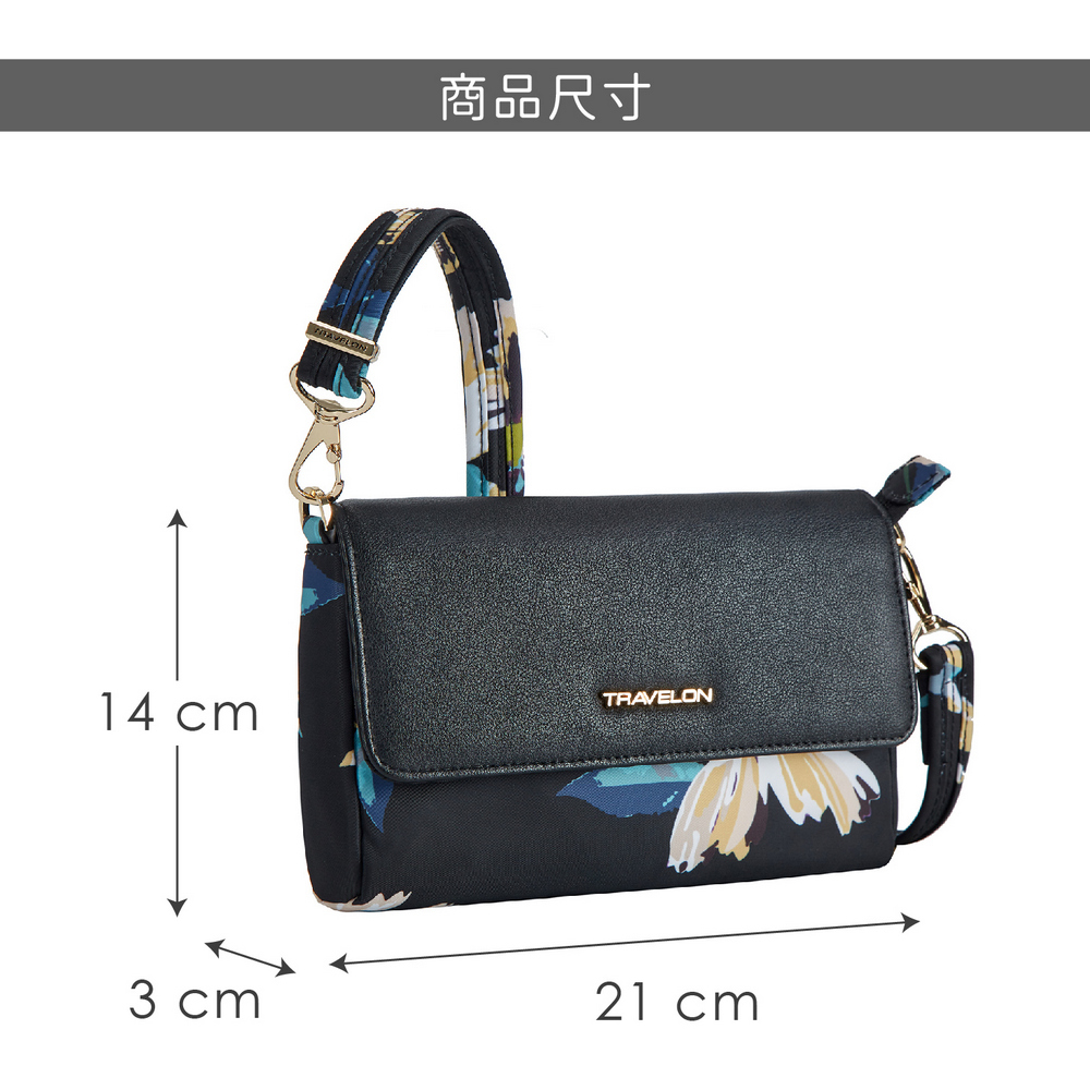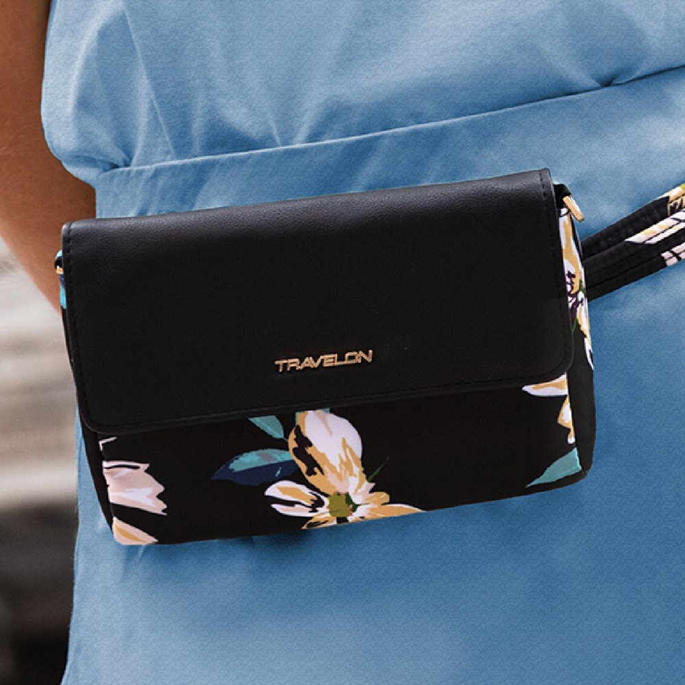 美國 TRAVELON - Addison皮革拼接防盜斜背腰包(花卉) / 側背包 斜背包 背帶包 防割防搶