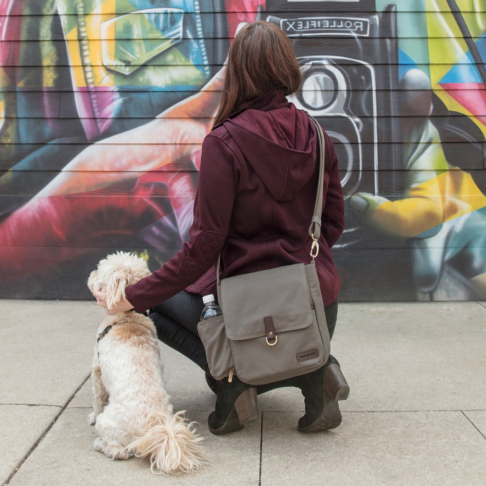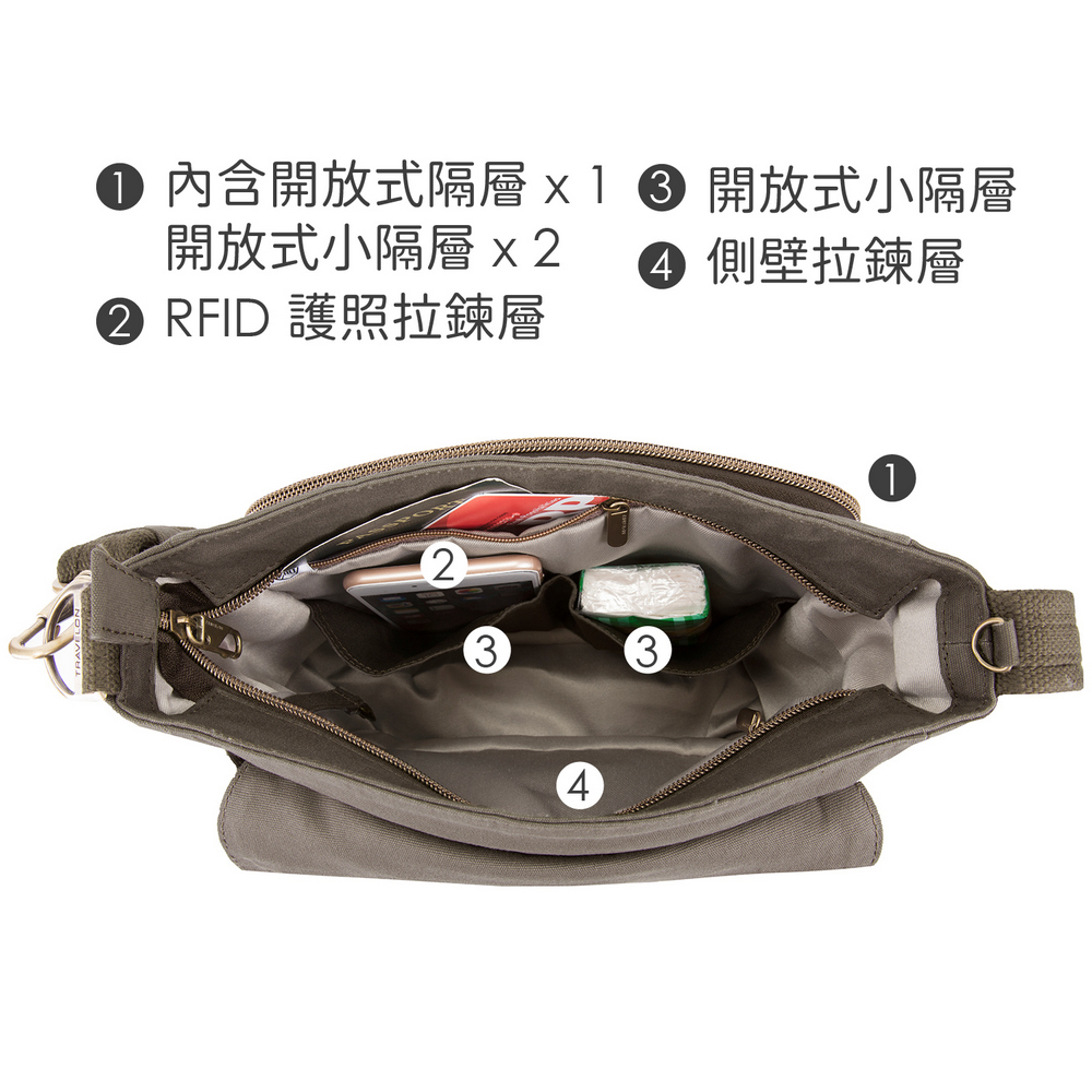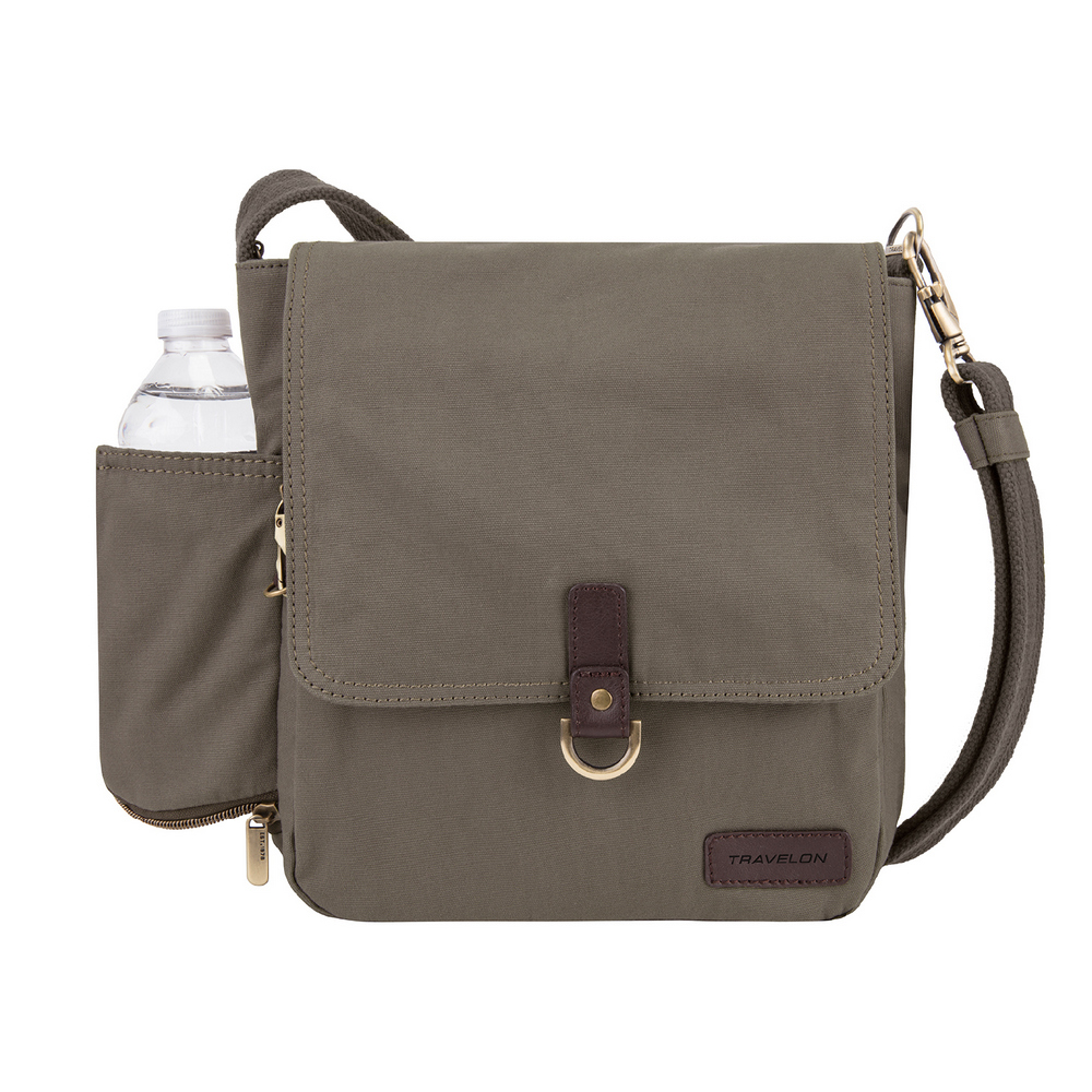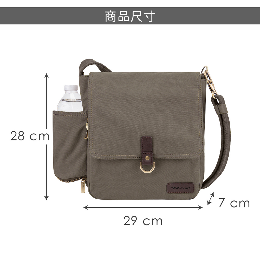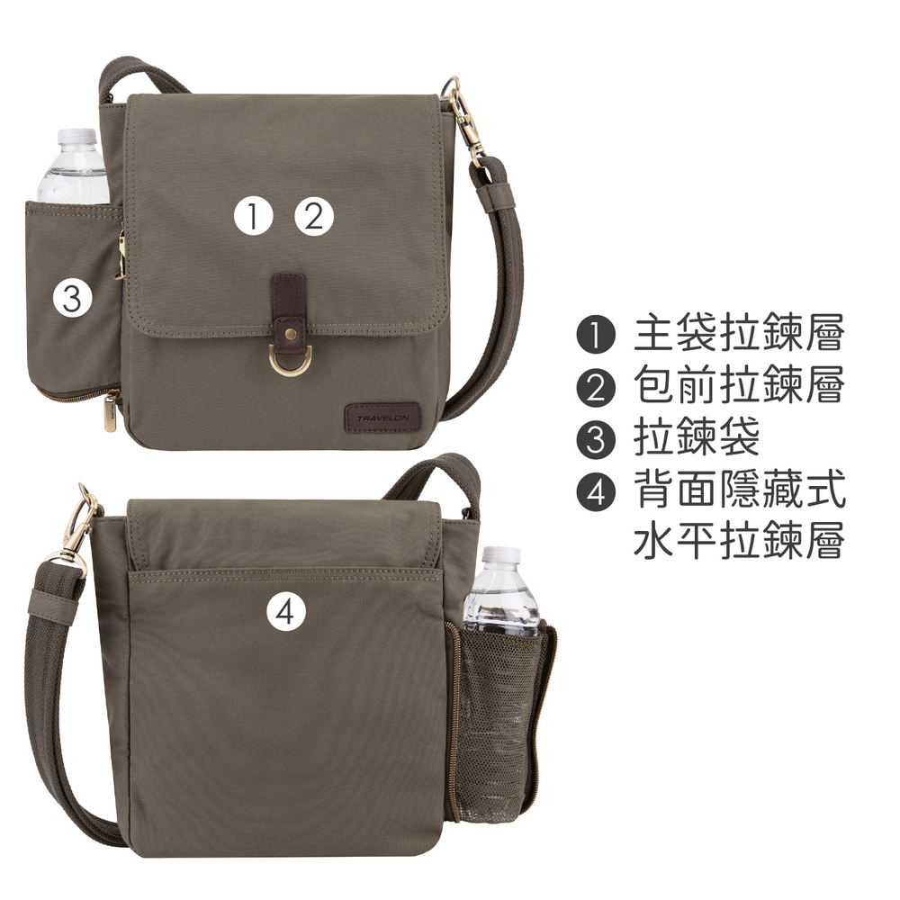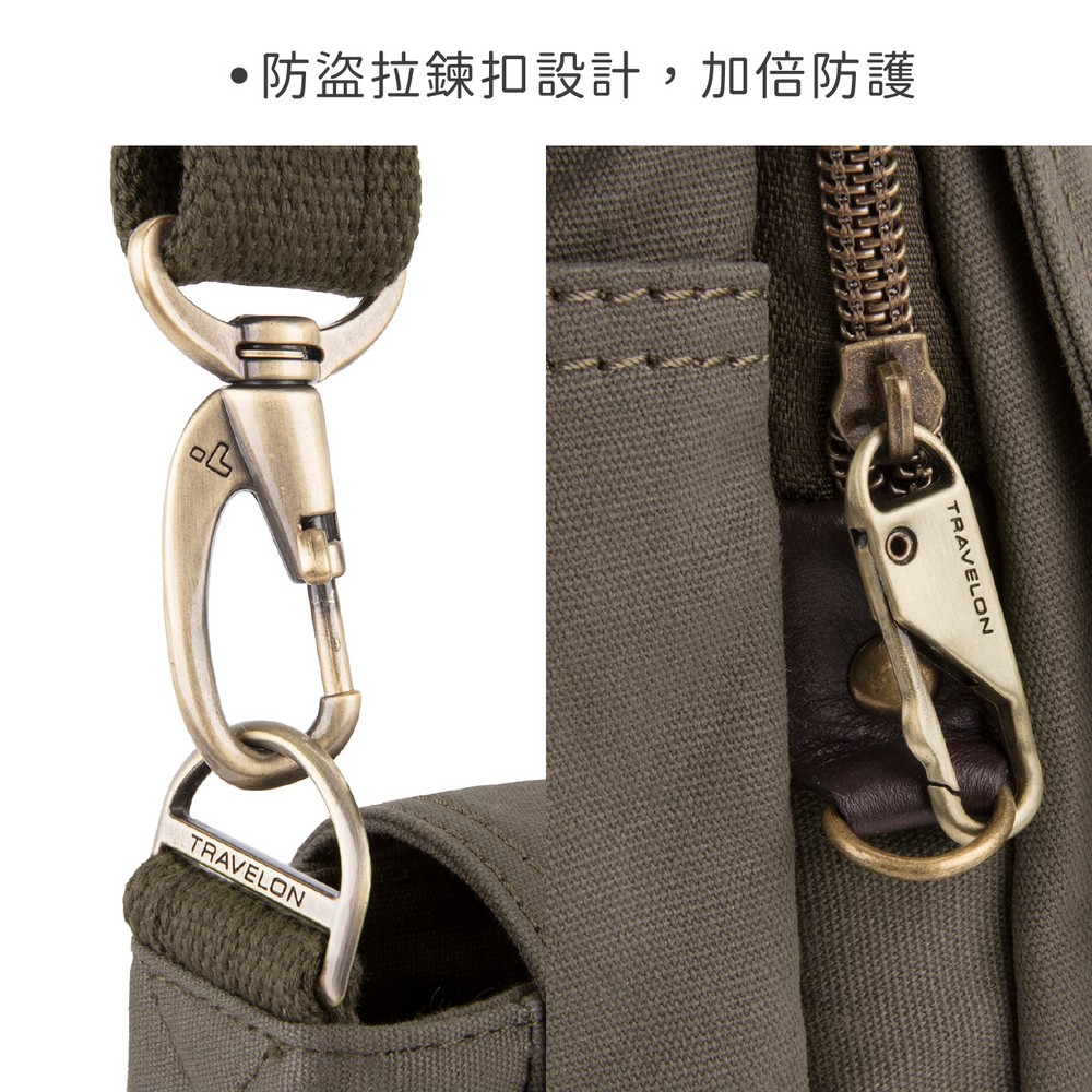 美國 TRAVELON - Courier帆布掀蓋三層防盜斜背包(棕) / 側背包 斜背包 背帶包 防割防搶
