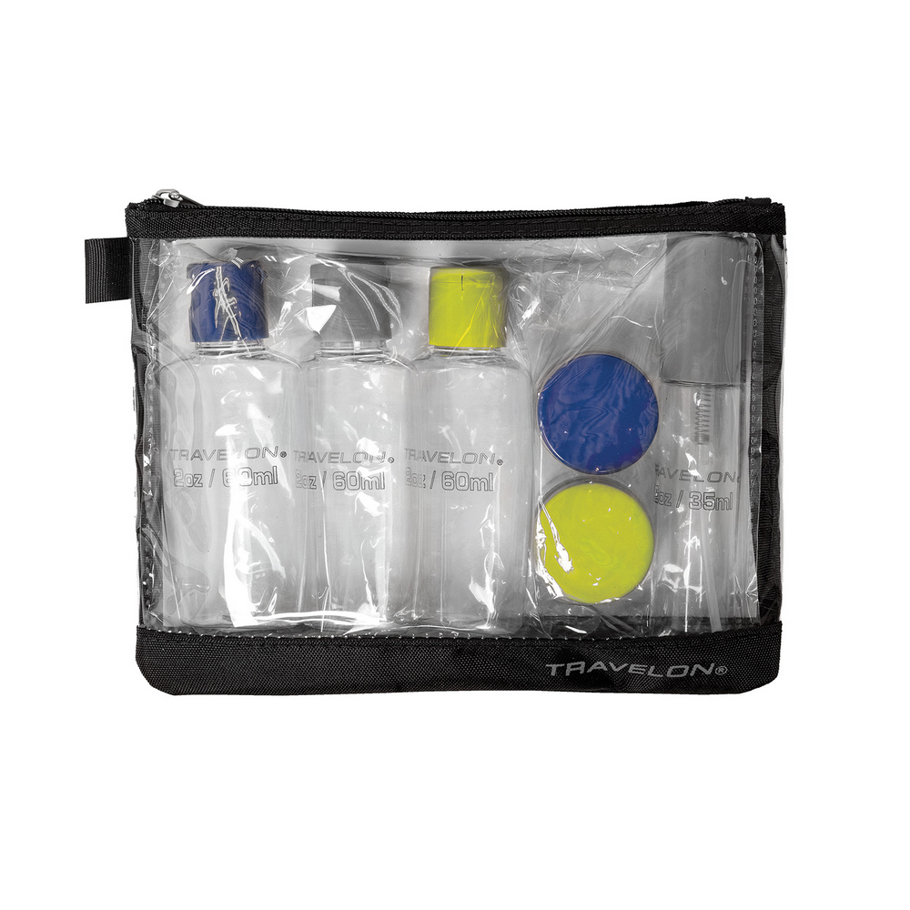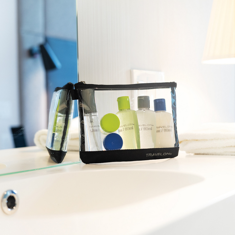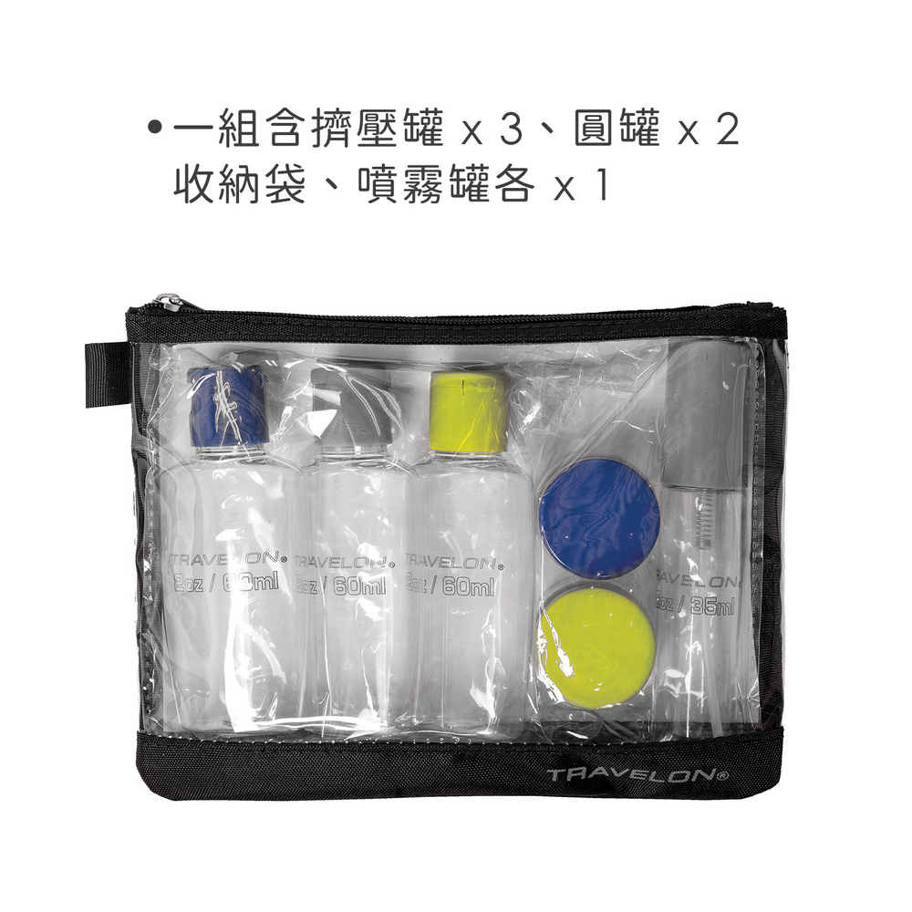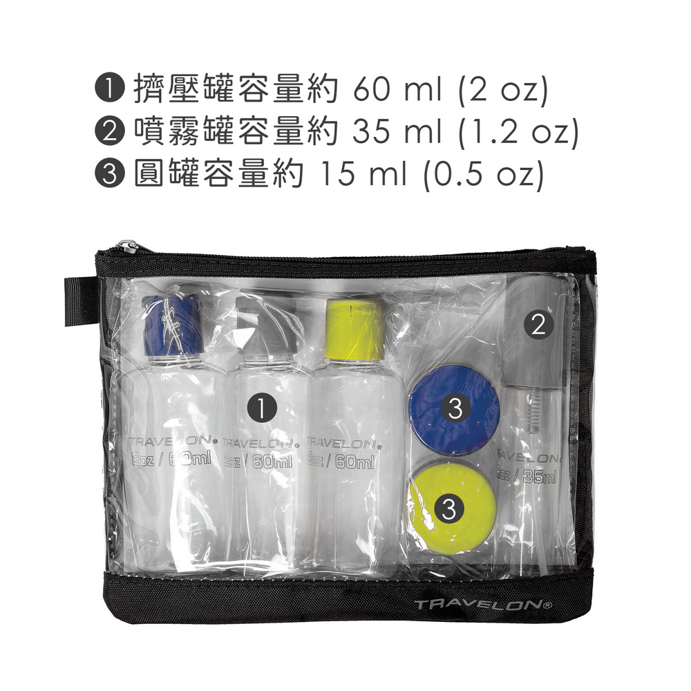 美國 TRAVELON - 拉鍊盥洗包+分裝瓶罐6件組(黑) / 化妝包 收納包 旅行小包 盥洗包