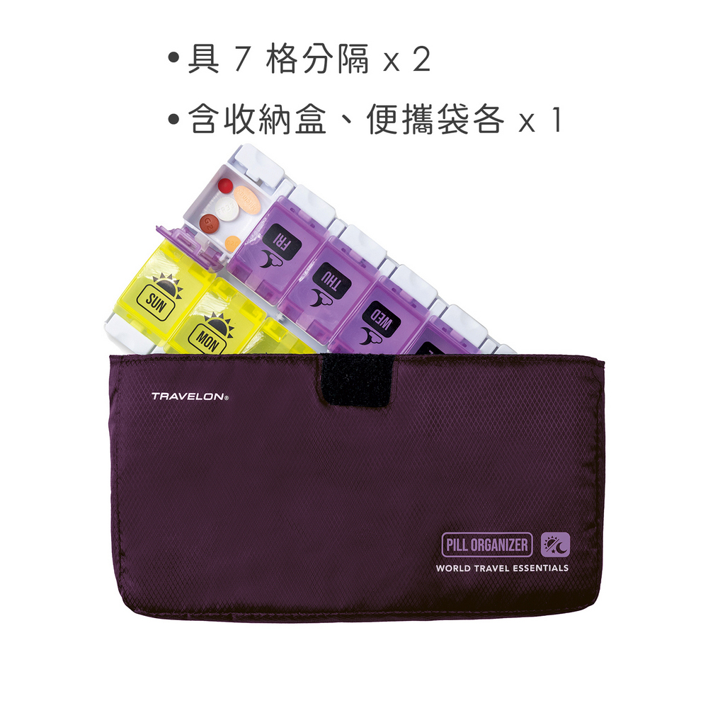 美國 TRAVELON - 一周藥品收納盒+便攜袋(黑莓紫) / 藥盒 分裝盒 分藥盒