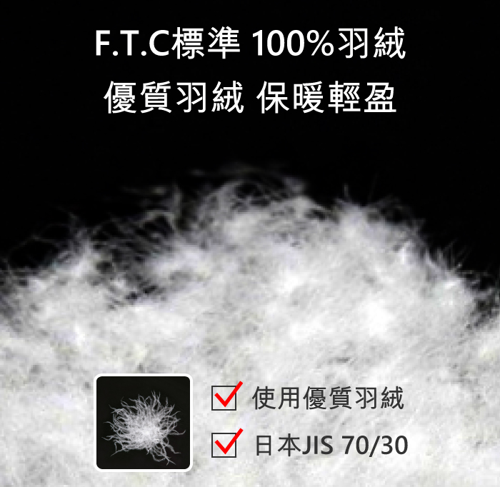 • 使用JIS70頂級羽絨,保暖性高又輕盈