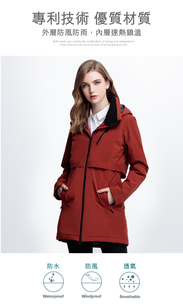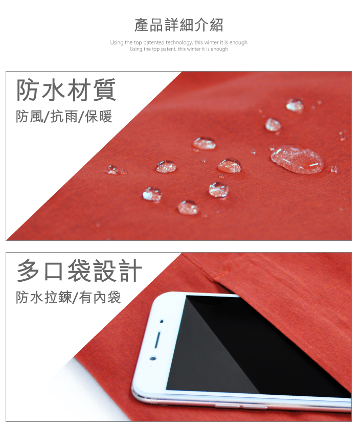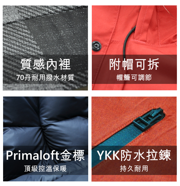 • 採用YKK防水拉鍊及檔風門襟,有效阻絕風雨