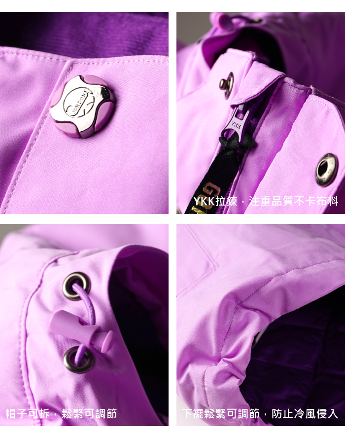 • 採用YKK防水拉鍊及檔風門襟,有效阻絕風雨