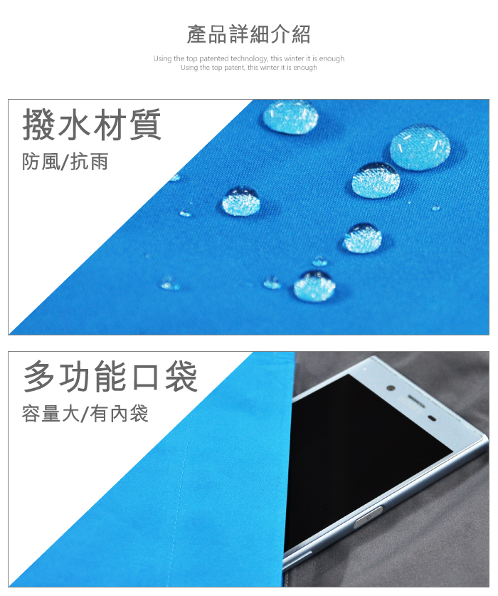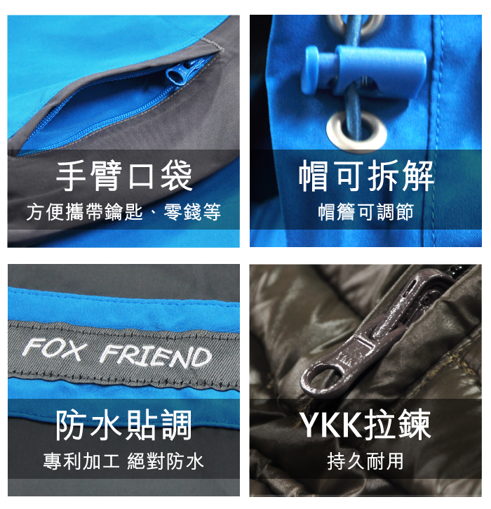 • 採用YKK防水拉鍊及檔風門襟,有效阻絕風雨