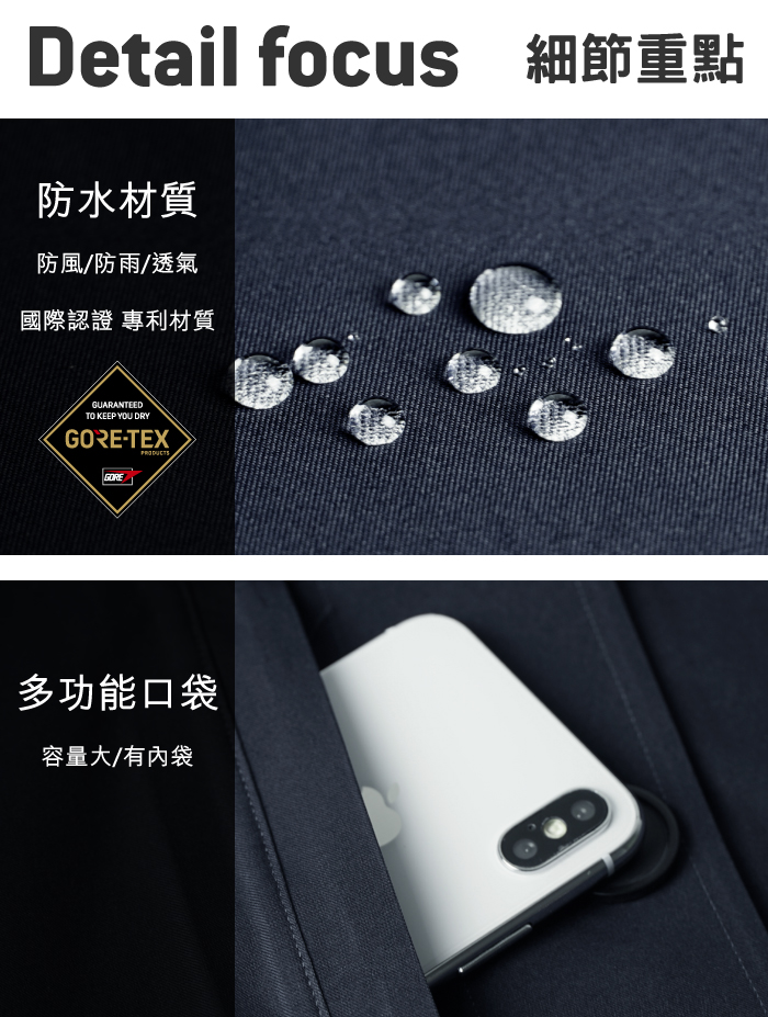 • GORE-TEX 原廠防水貼條及縫合技術,結構式防水設計,有效防止雨水進入