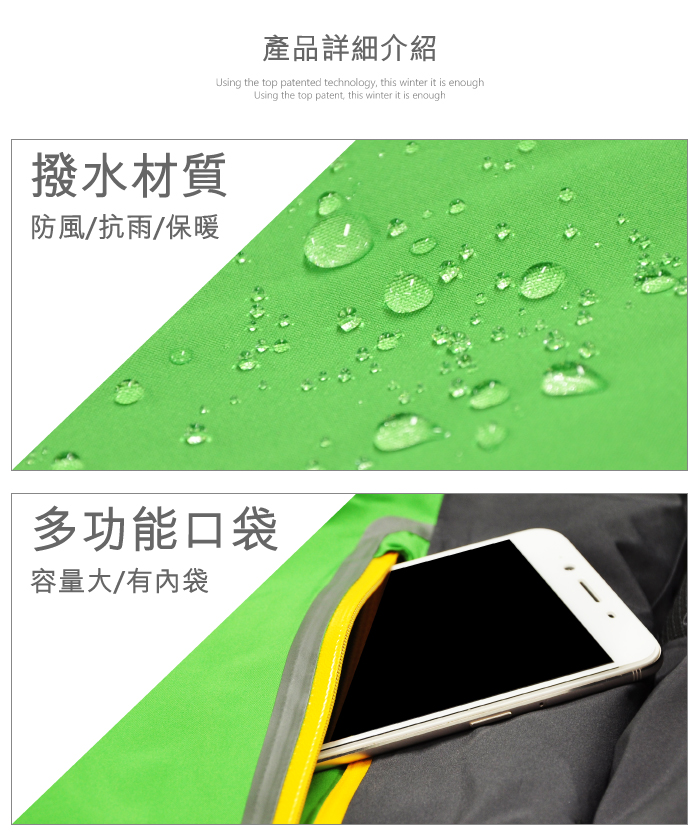 • 採用YKK防水拉鍊及檔風門襟,有效阻絕風雨