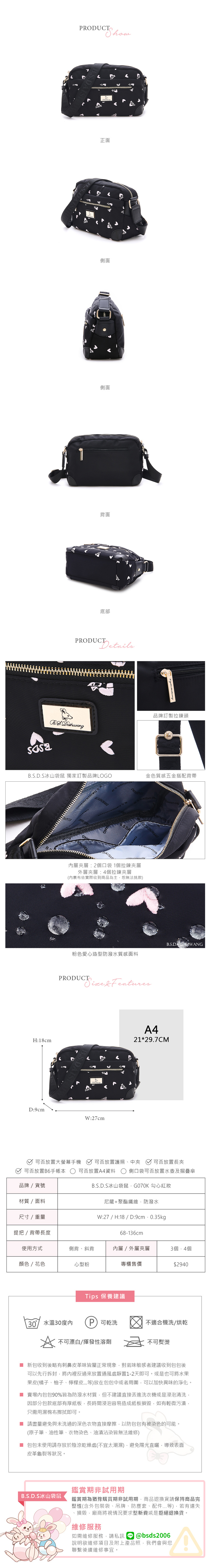 B.S.D.S冰山袋鼠 - 勾心紅妝 - 甜美刺繡圓角造型斜背包 - 心型粉【G070K】
