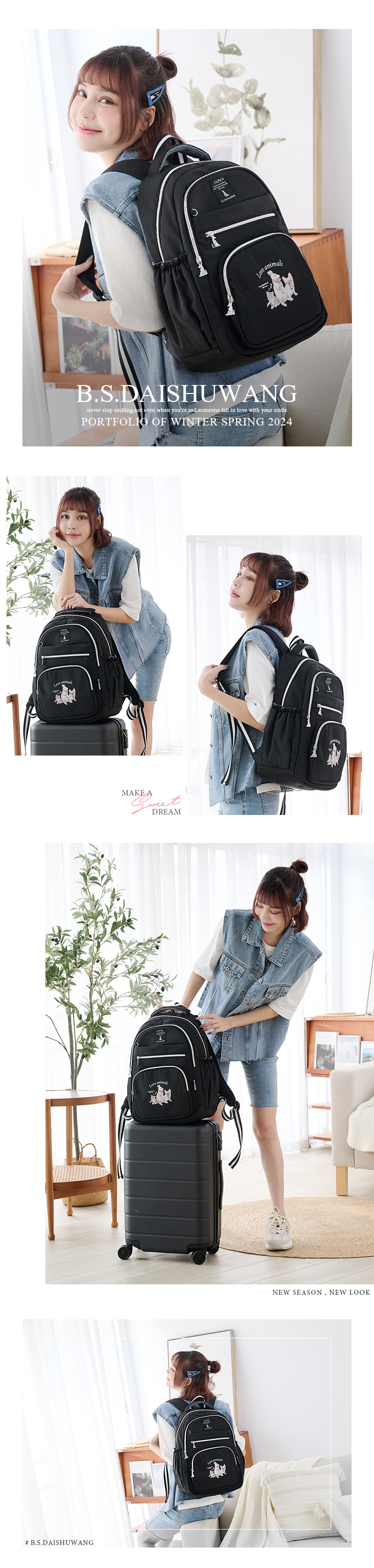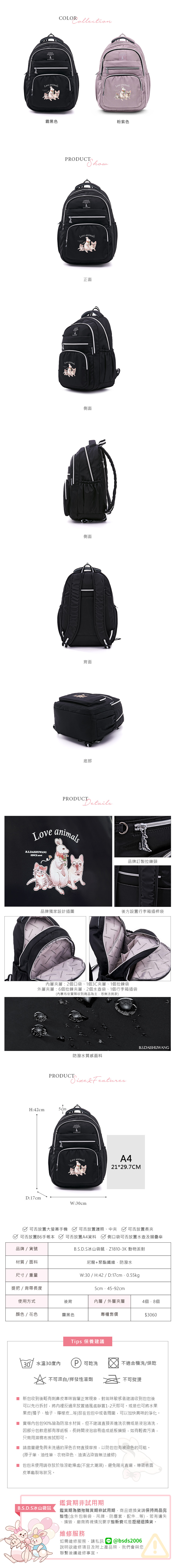 B.S.D.S冰山袋鼠 - 動物派對 - 輕旅多層大容量附插袋後背包 - 霧黑色【Z1810-3K】