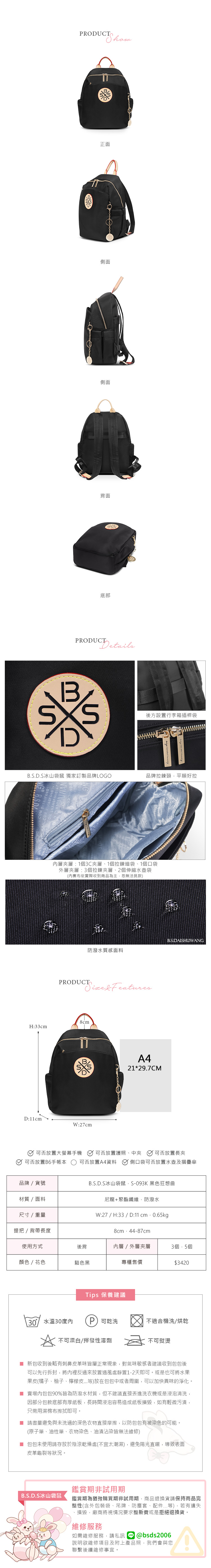 B.S.D.S冰山袋鼠 - 黑色狂想曲 - 古典輕奢多層附插袋後背包 - 駱色黑【S-093K】