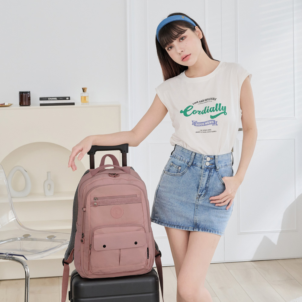 B.S.D.S冰山袋鼠 - 樂活遊記 - 格紋多口袋附插袋胸扣後背包 - 香檳粉【X1123CP】