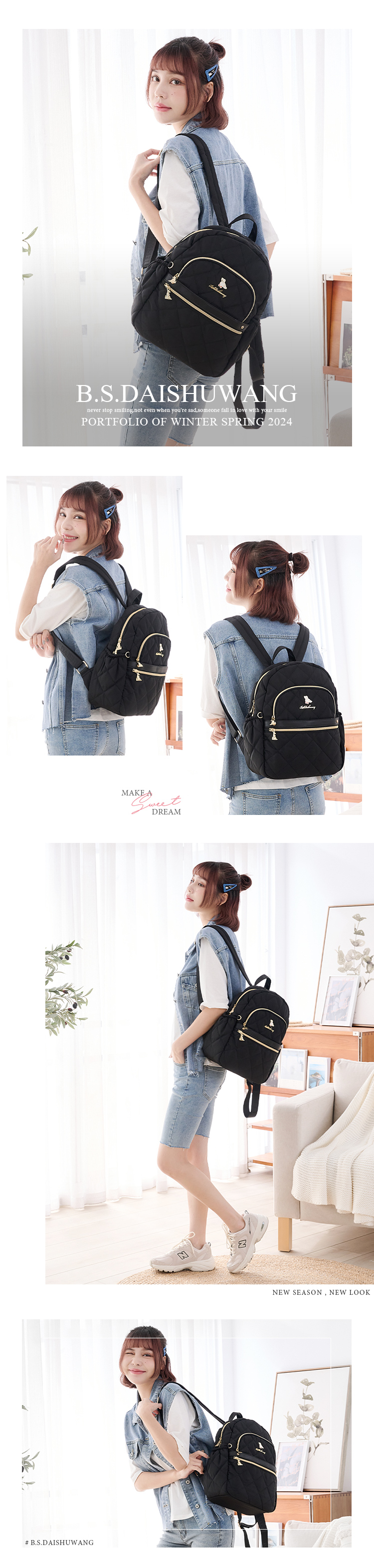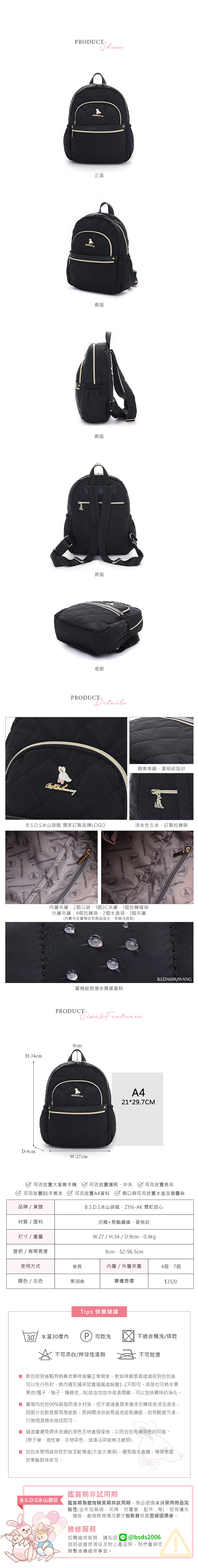 B.S.D.S冰山袋鼠 - 霓虹甜心 - 菱格多口袋後背包 - 黑加侖【Z116-AK】