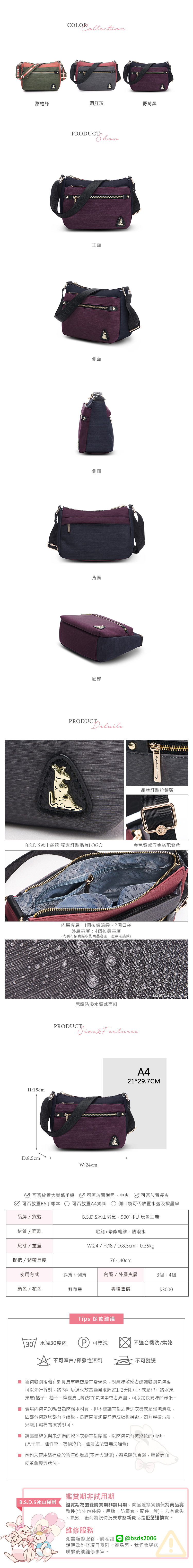 B.S.D.S冰山袋鼠 - 玩色主義 - 雙色輕量多層斜背包 - 野莓黑【9001-KU】