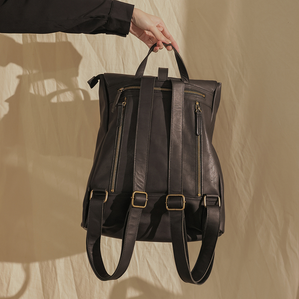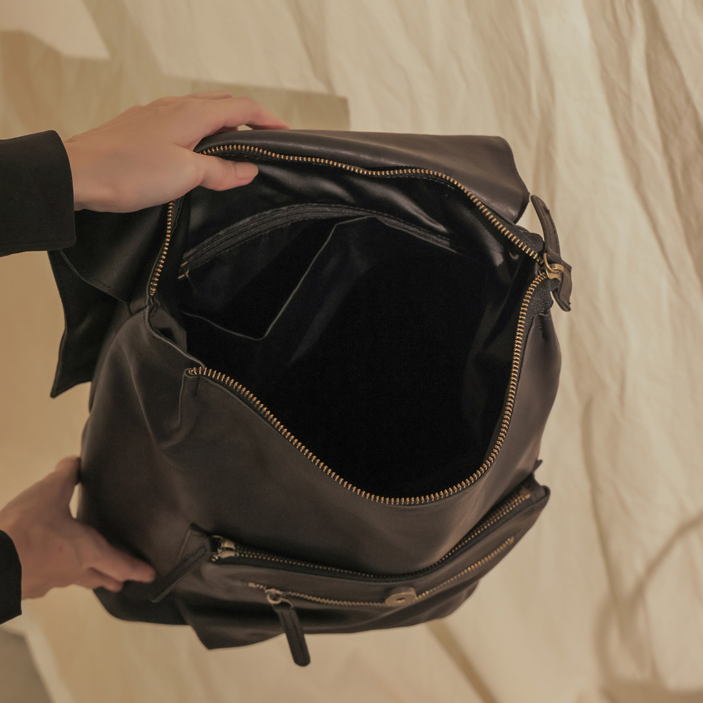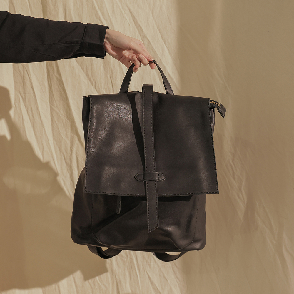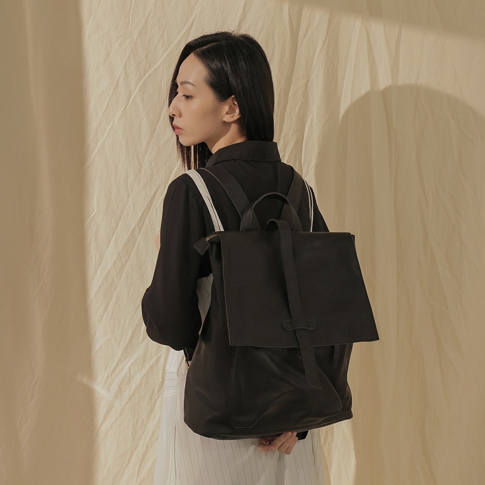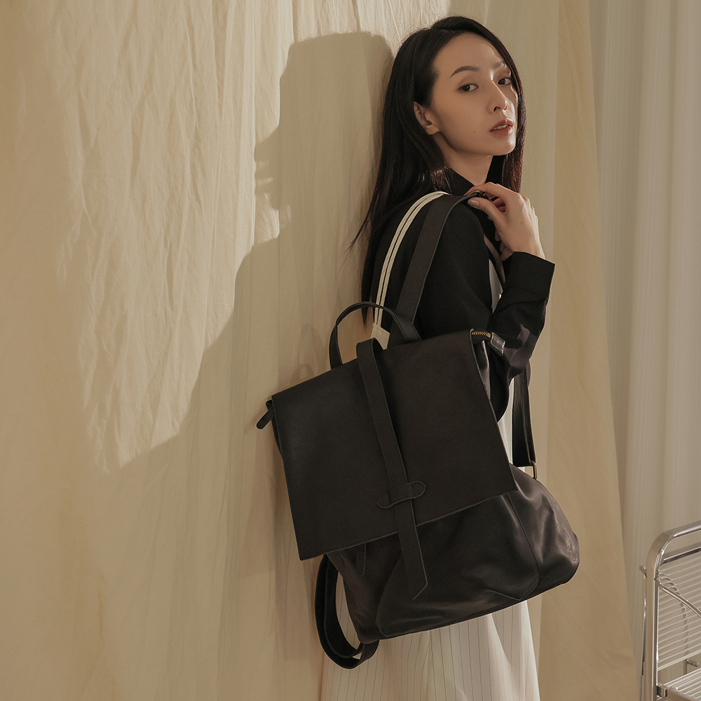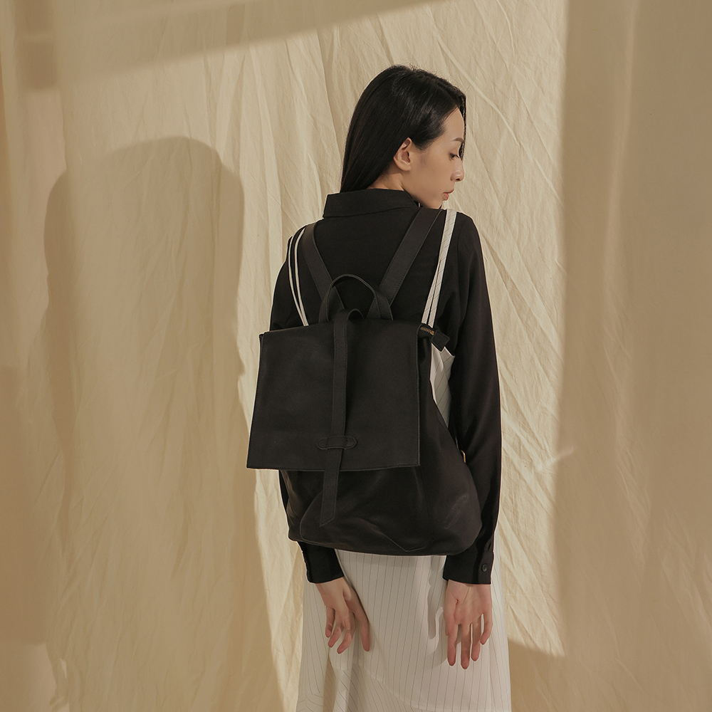 supportingrole 率性簡單多分層方形真皮後背包 黑