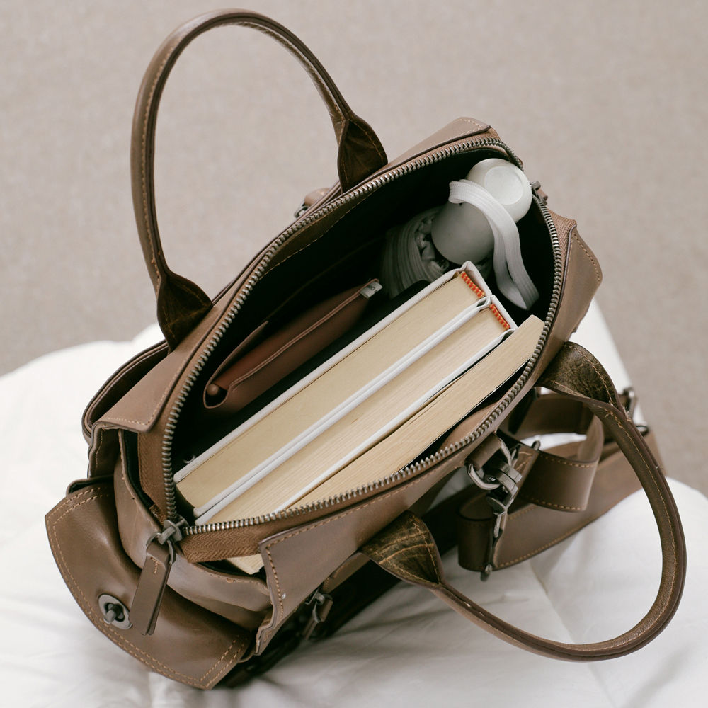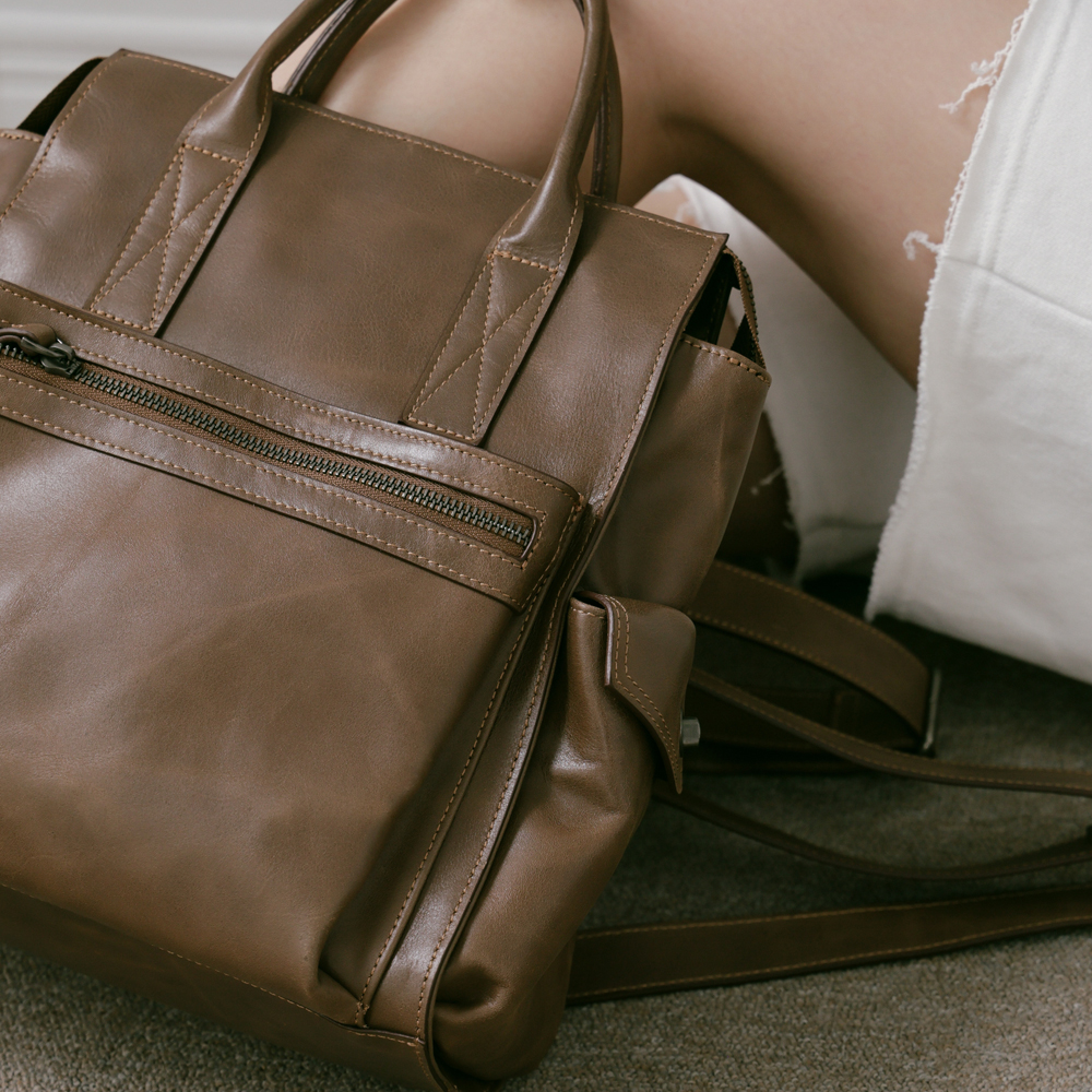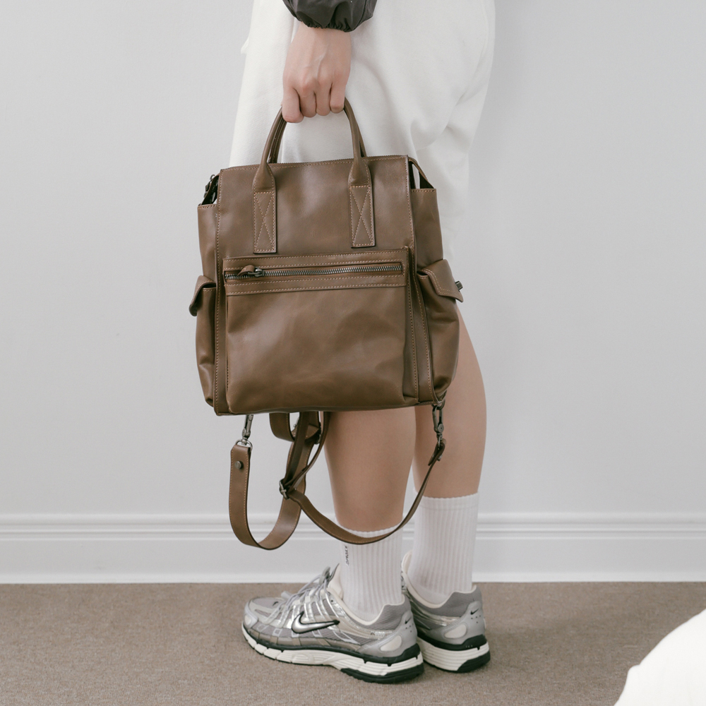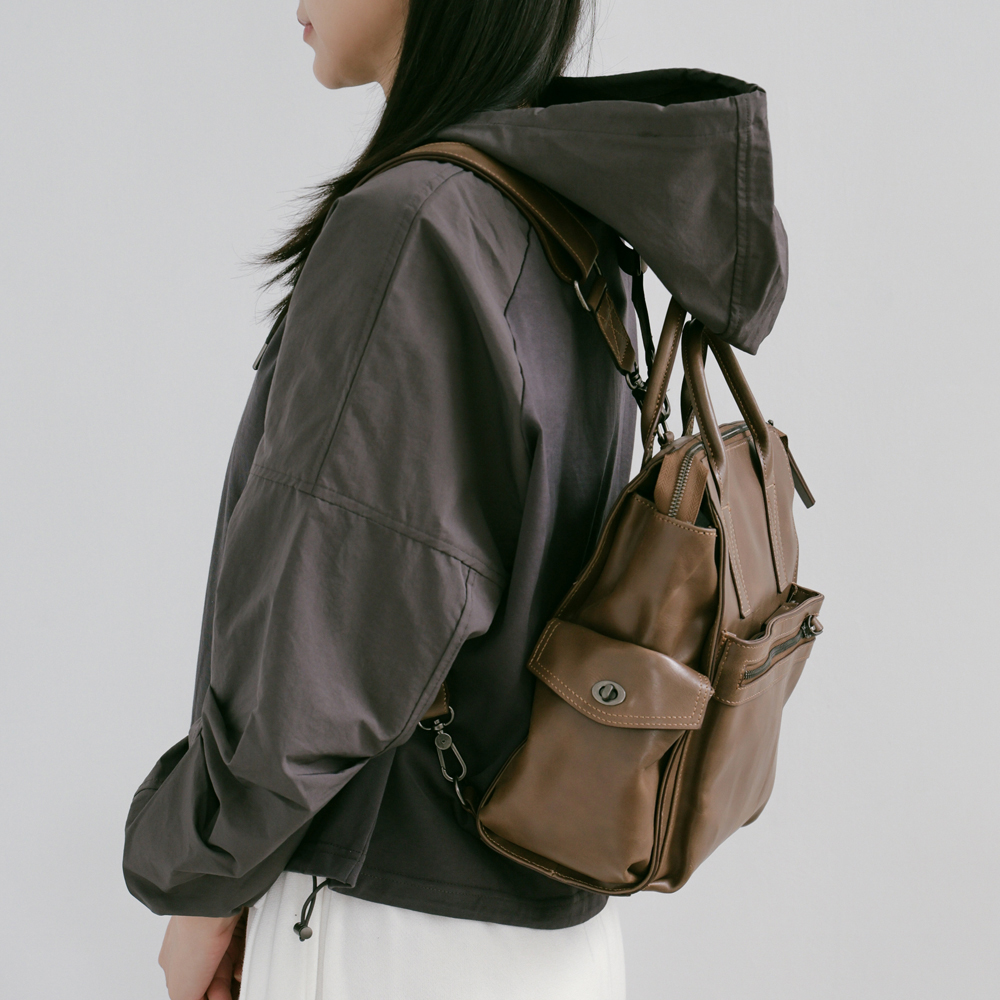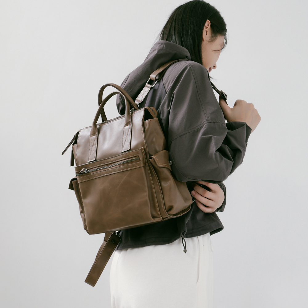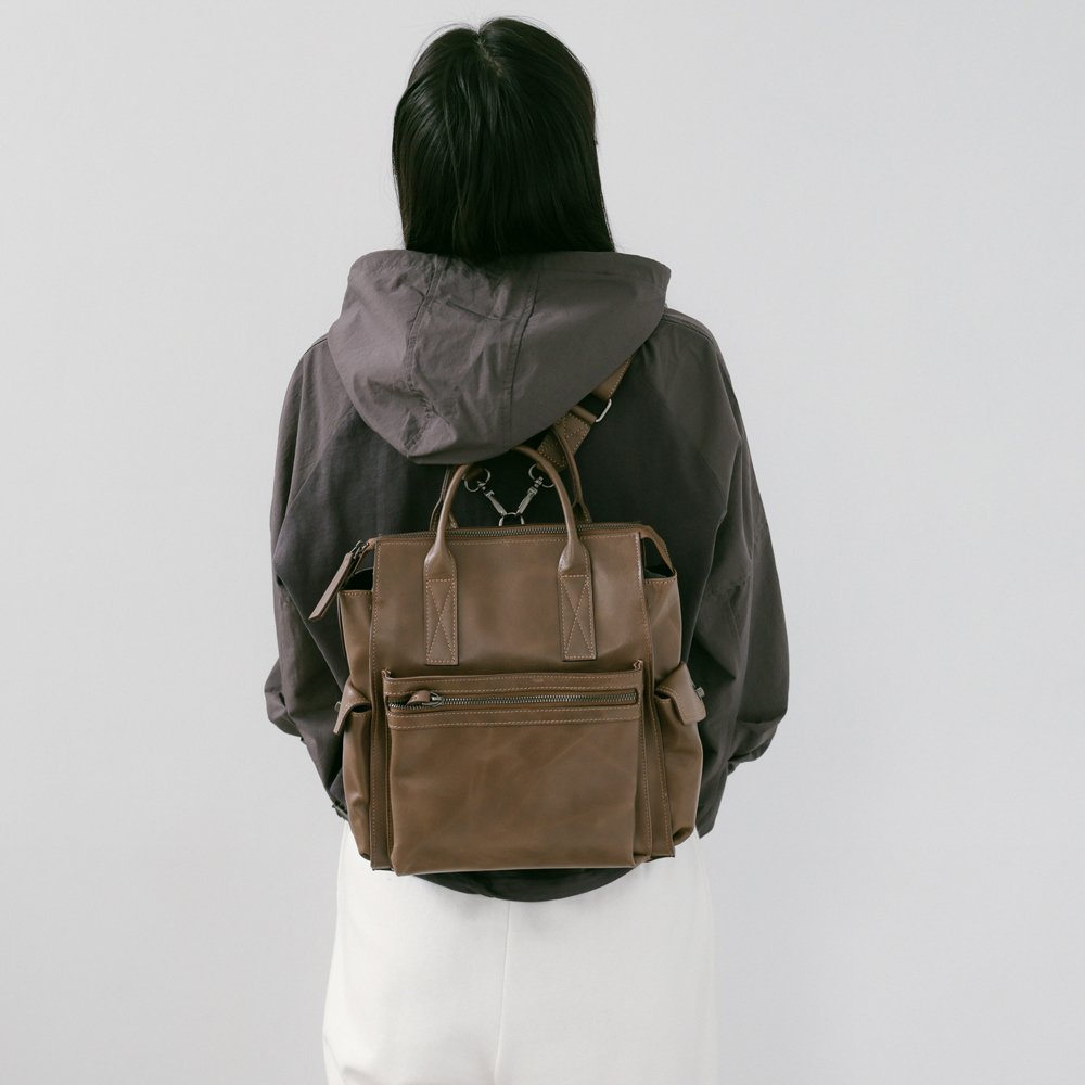 Supportingrole簡約多隔層多口袋真皮後背包 復古咖啡