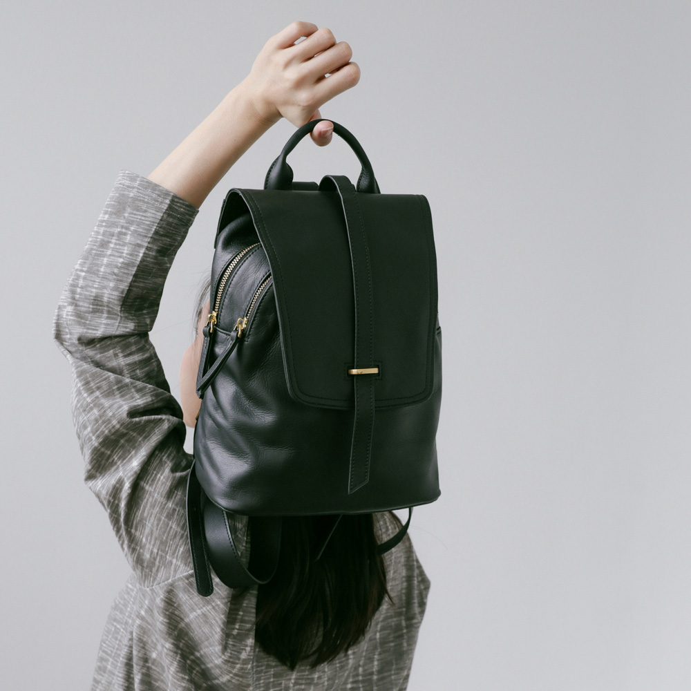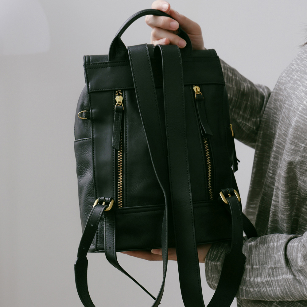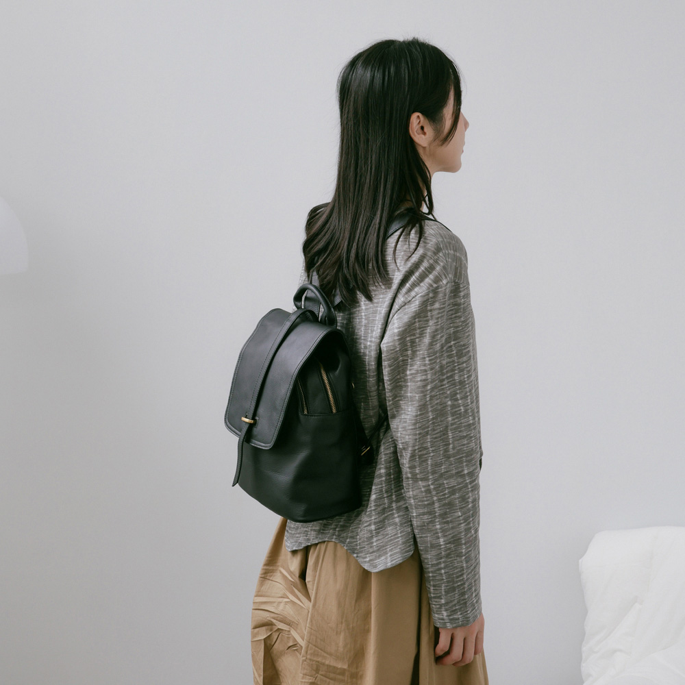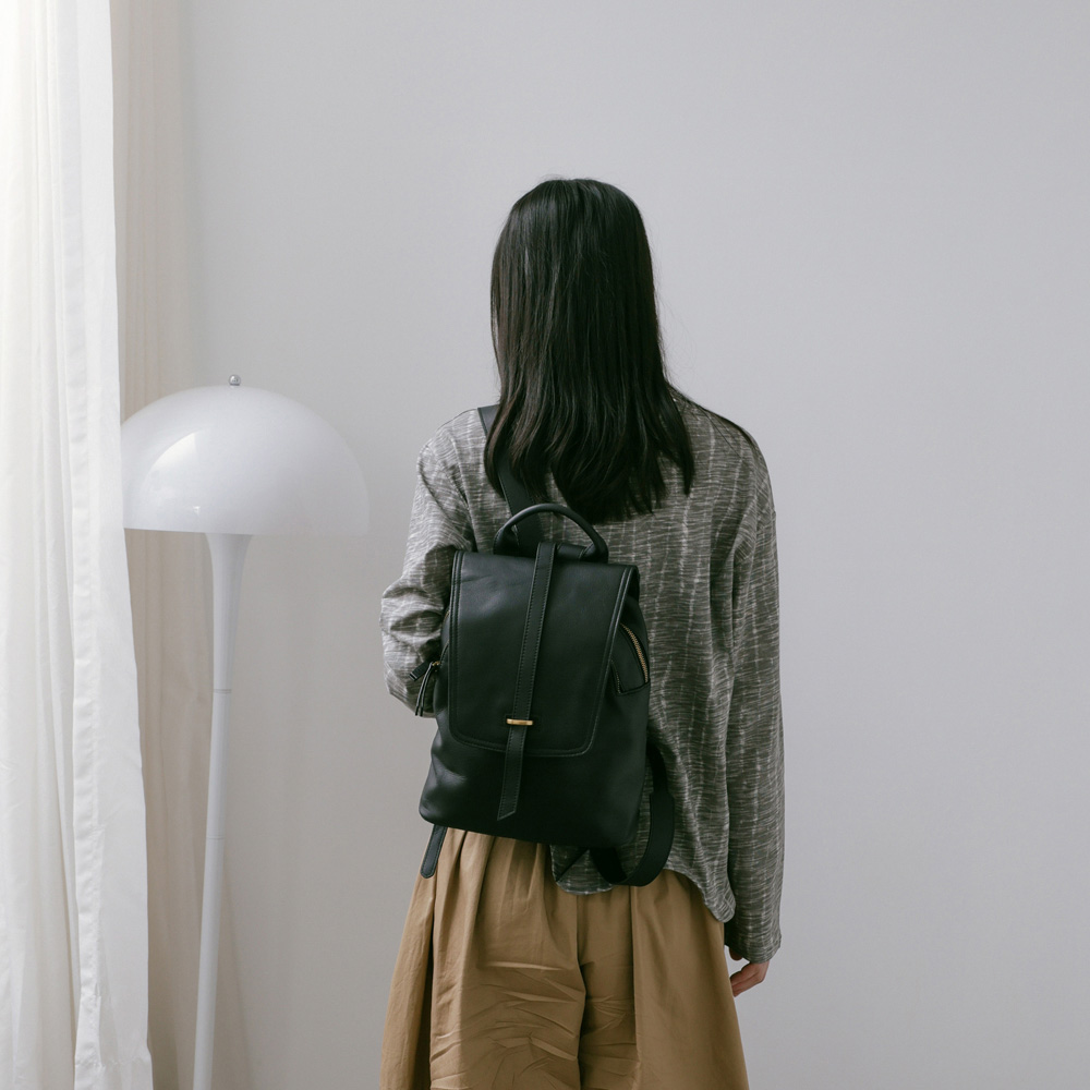 Supportingrole簡約百搭線條多隔層多口袋真皮後背包 黑