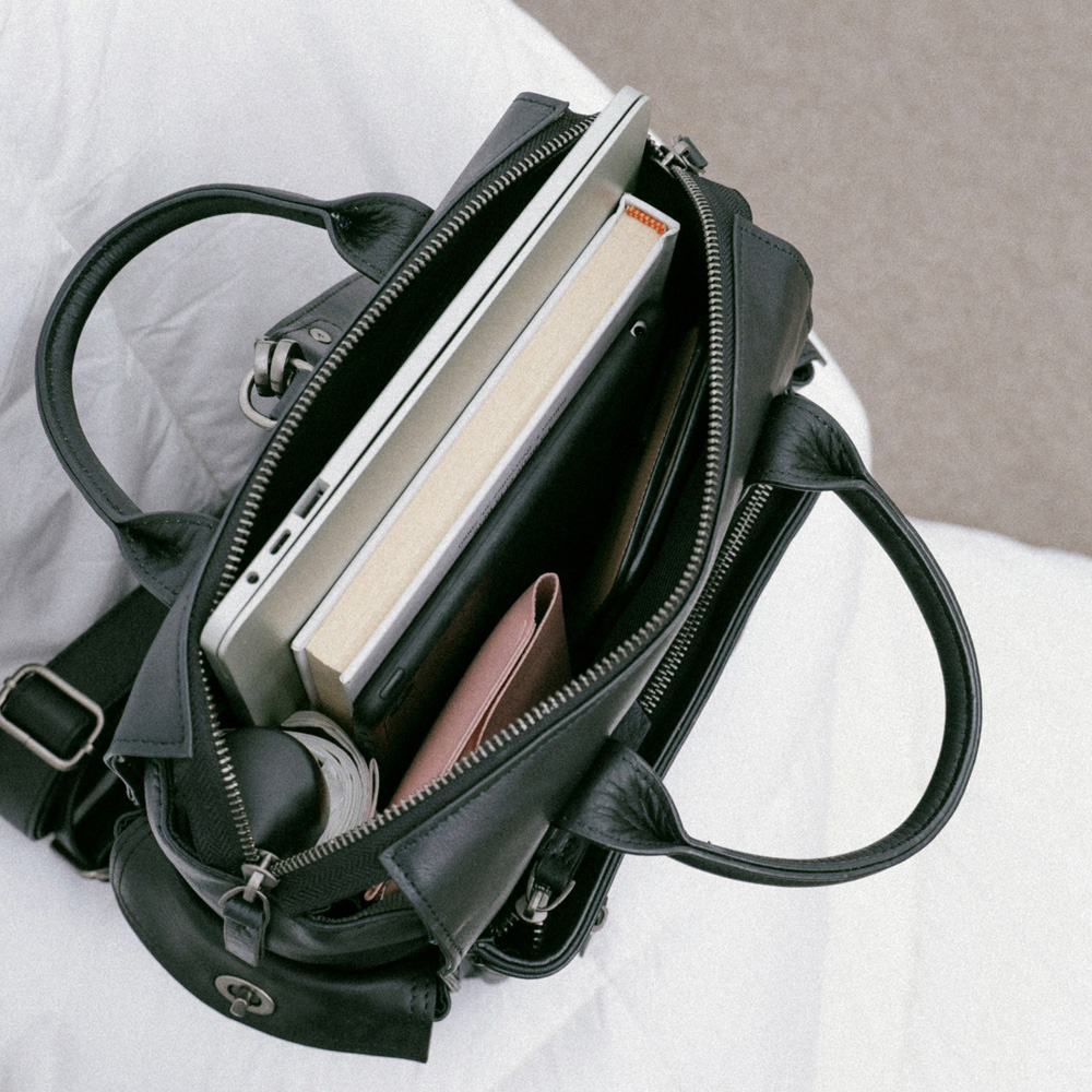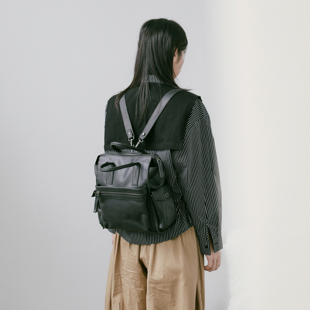 Supportingrole 簡約多隔層多口袋真皮後背包 復古黑