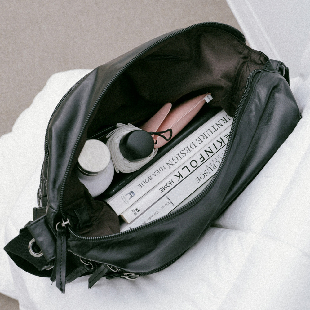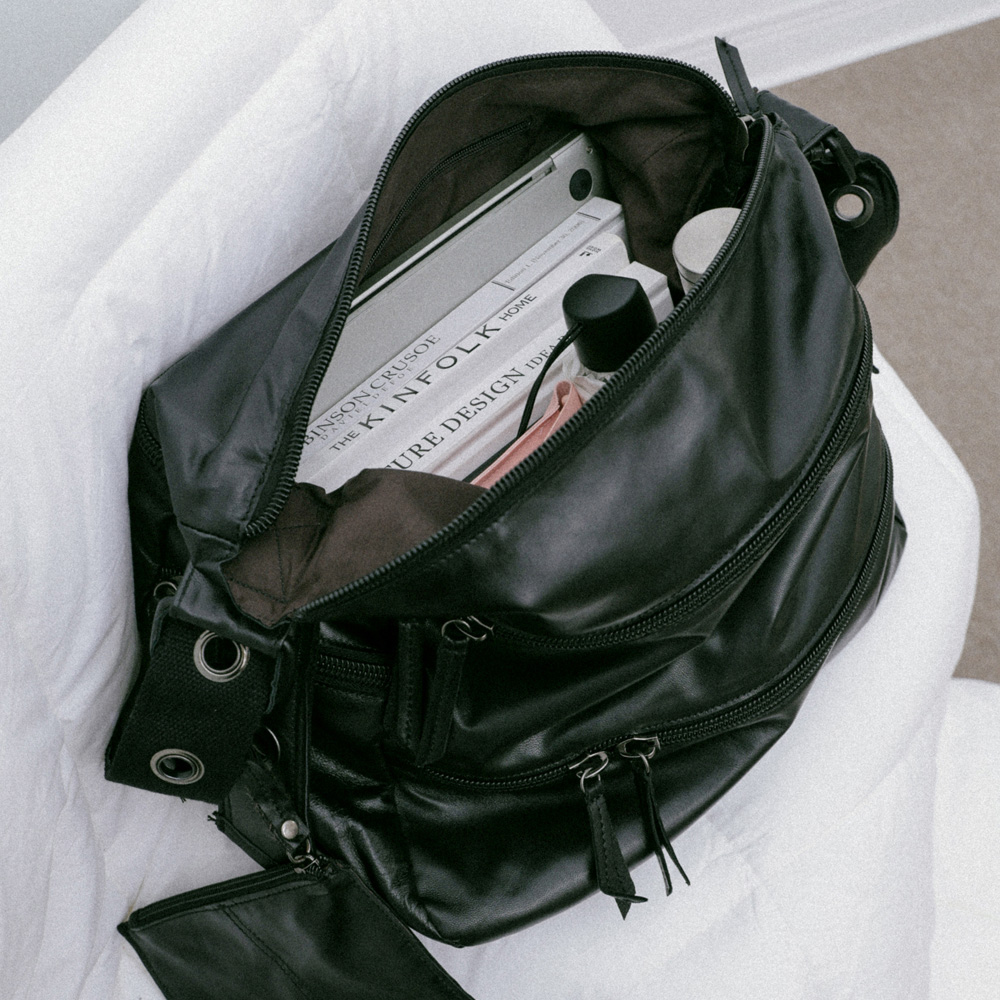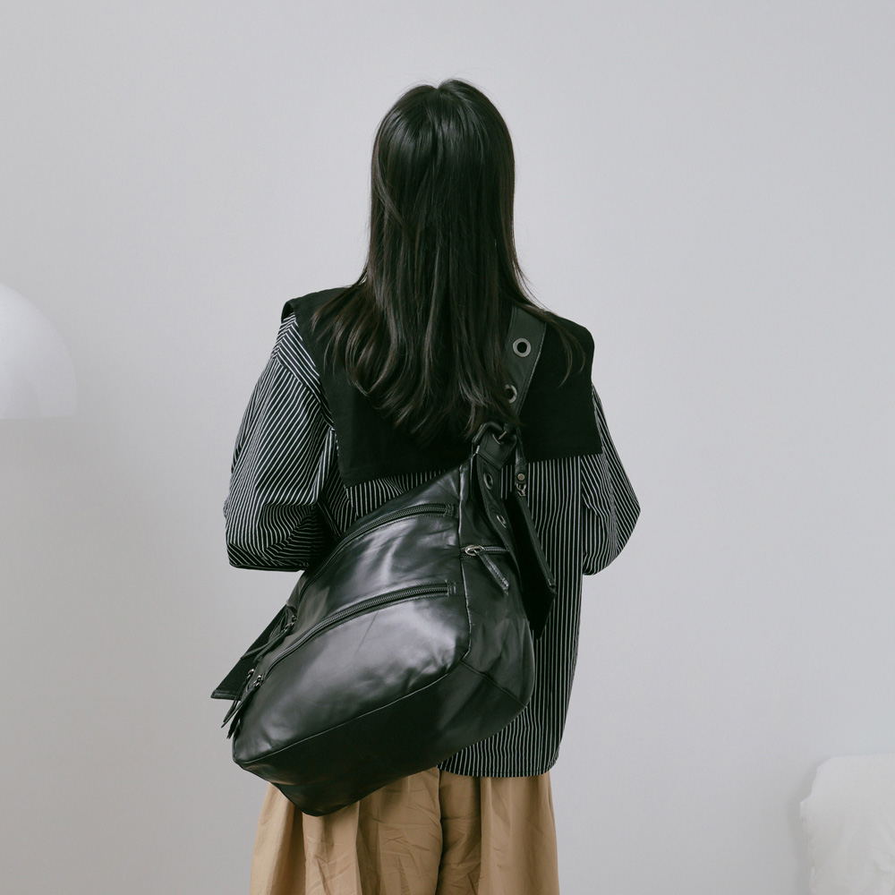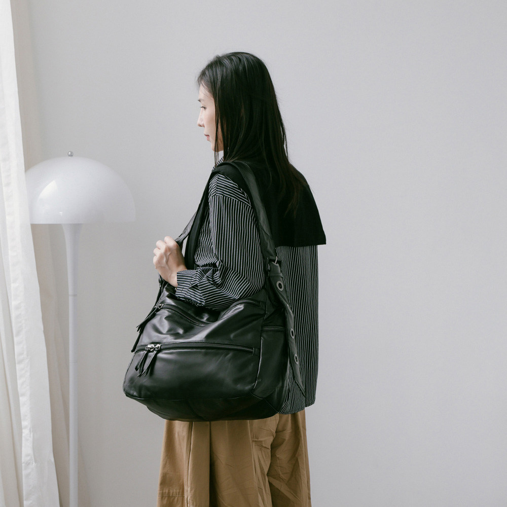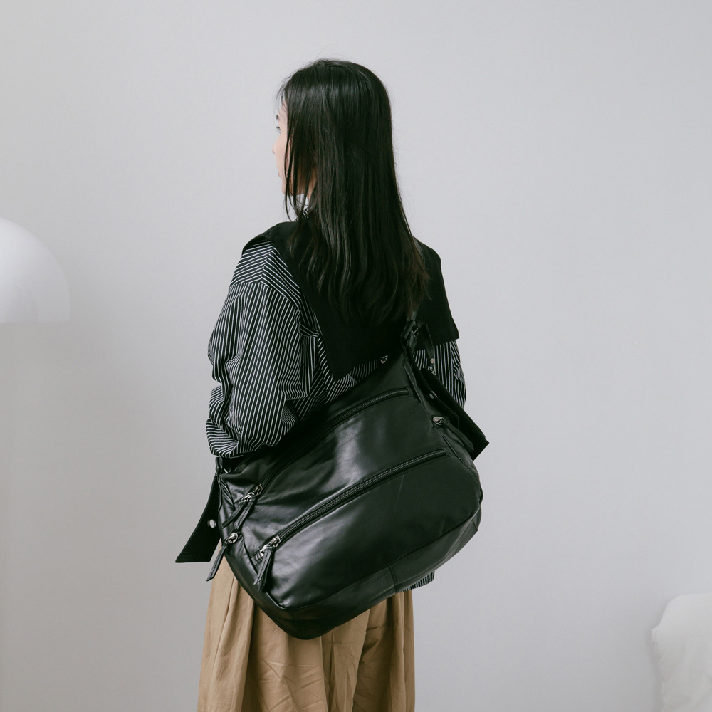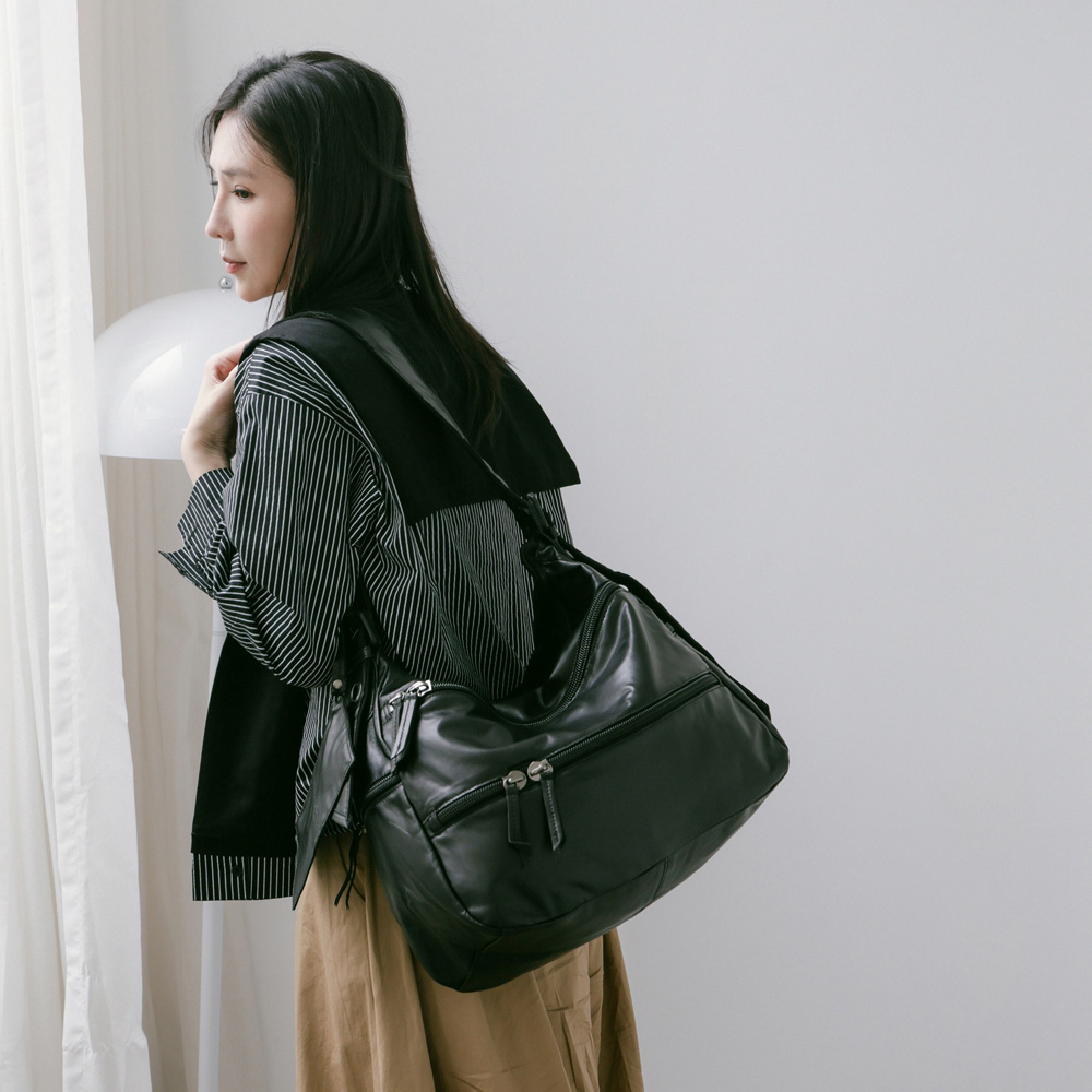 supportingrole 大容量多層拉鍊口袋百搭輕量旅行皮手提肩斜背包 黑