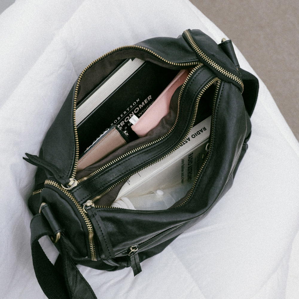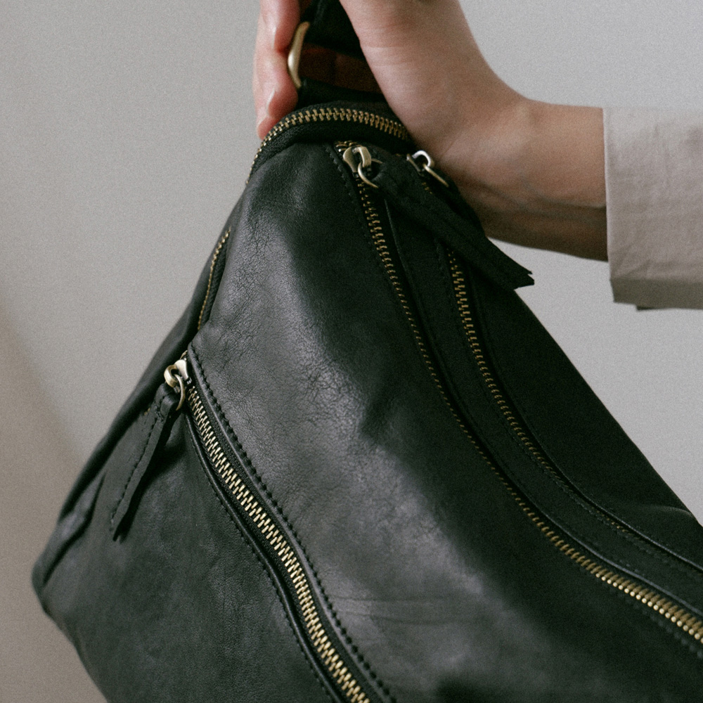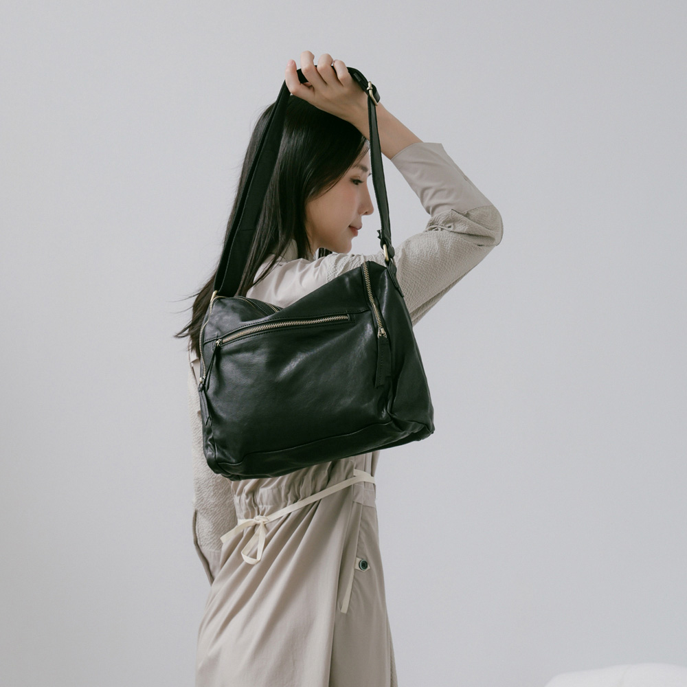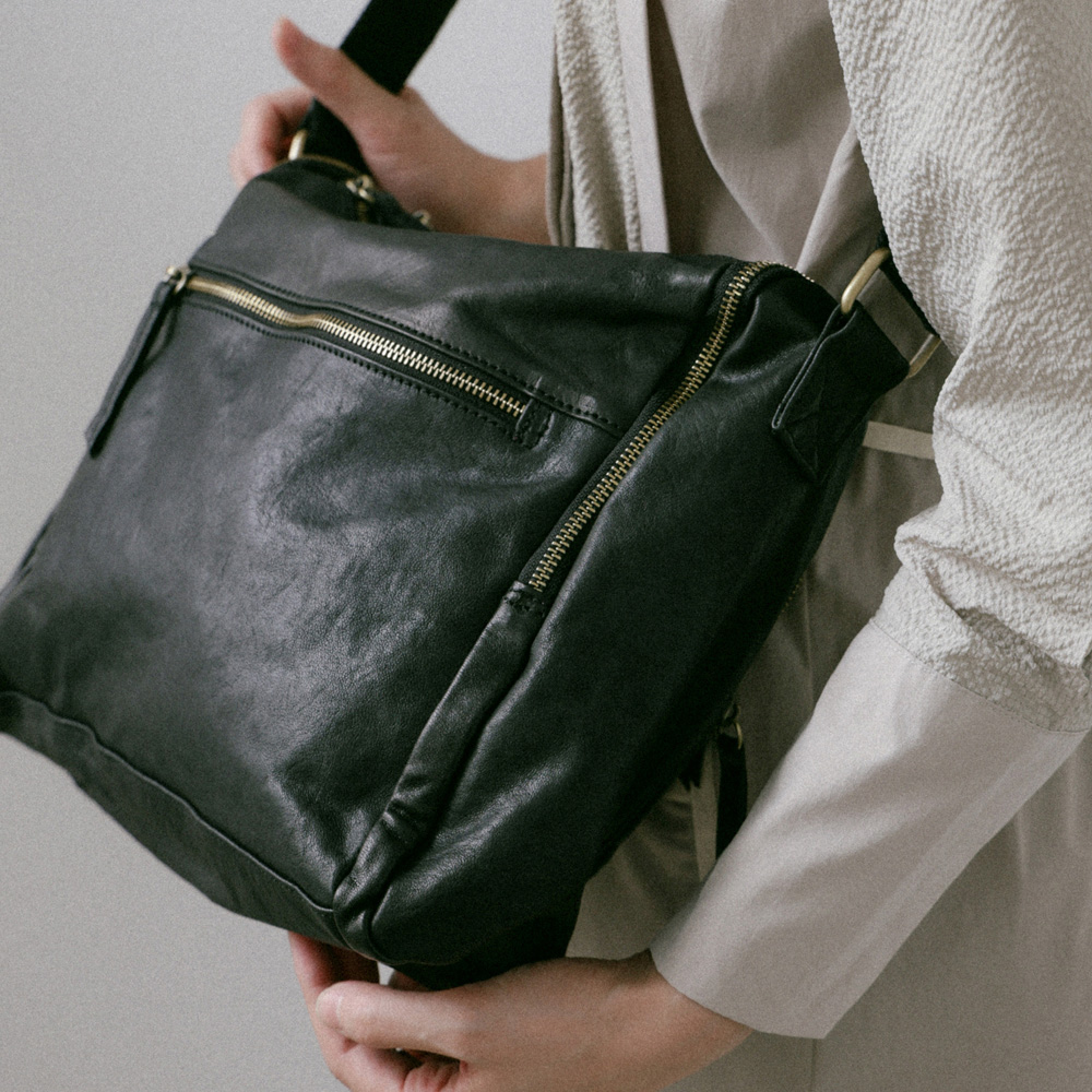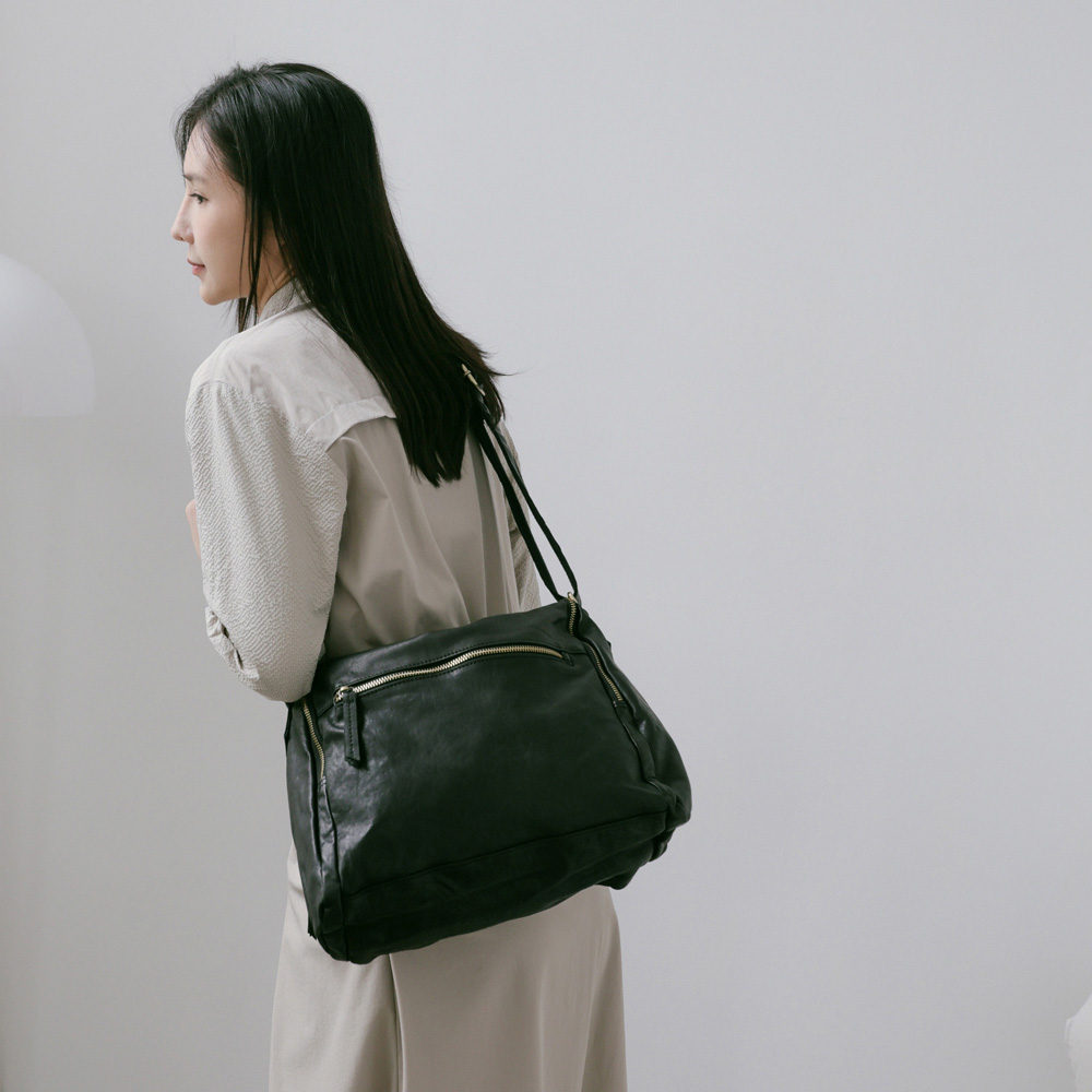 supportingrole 多層口袋容量拉鍊百搭輕量真皮肩斜背包 黑