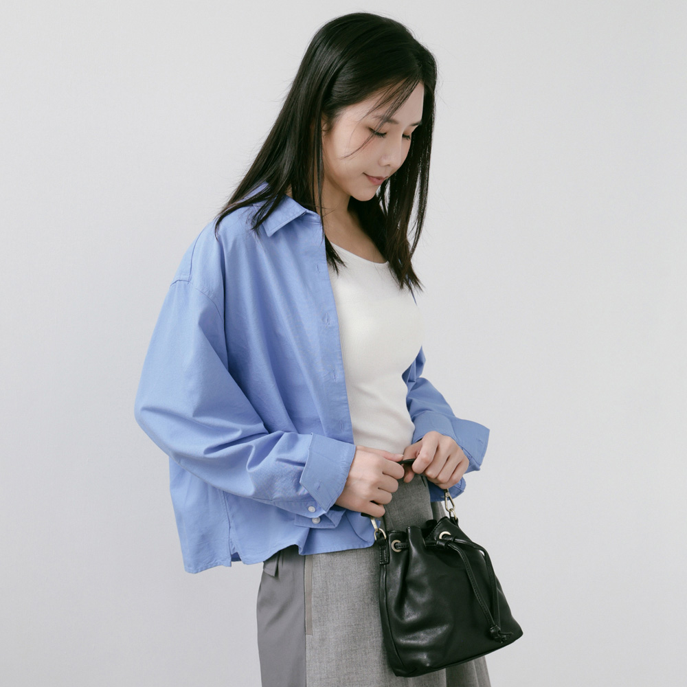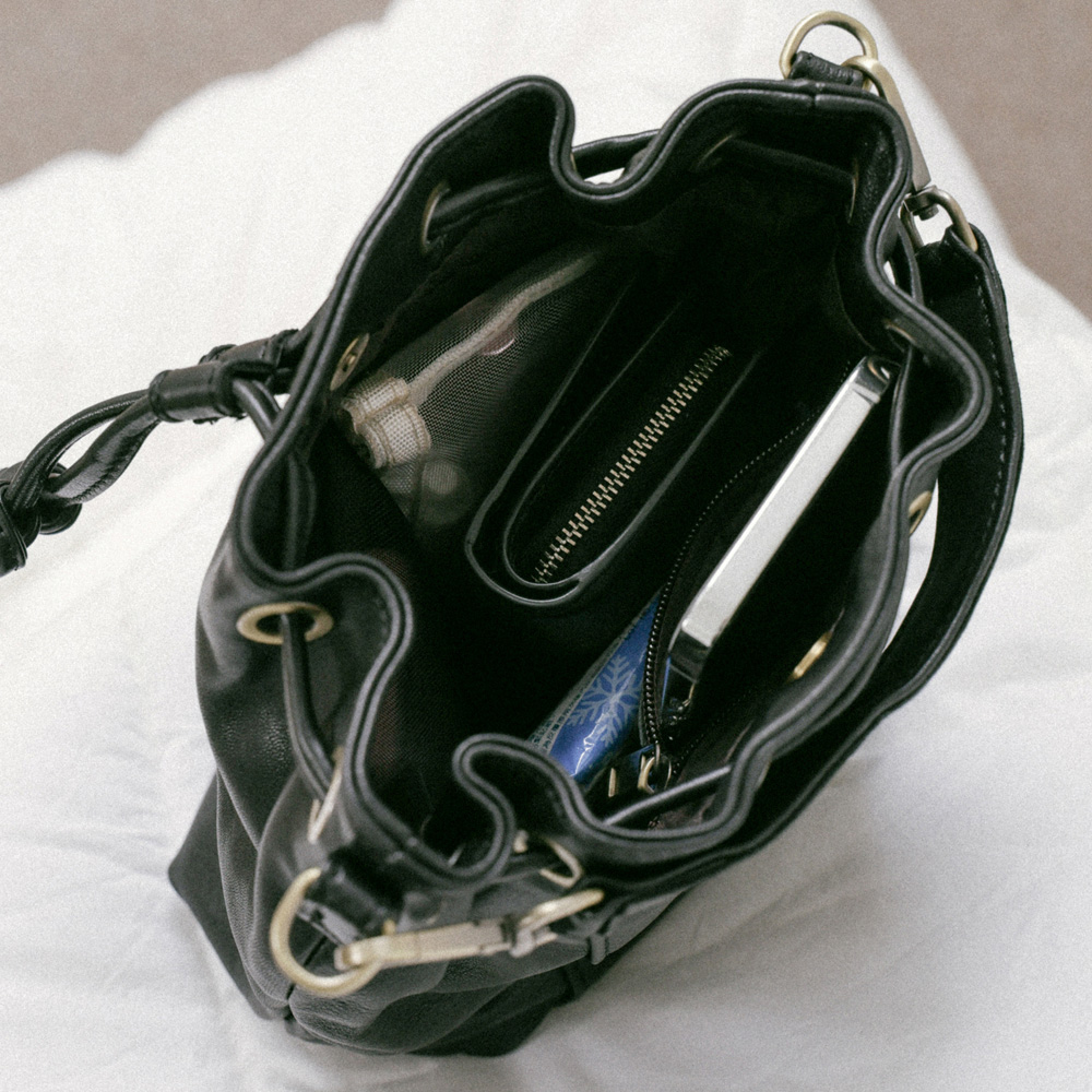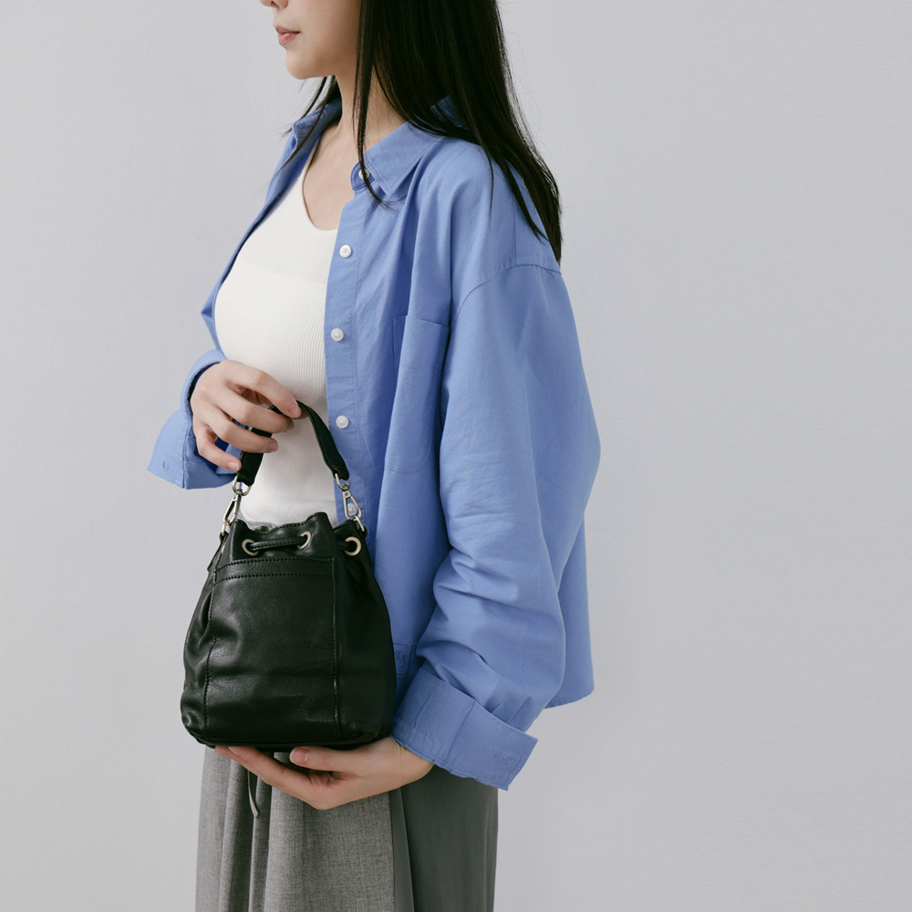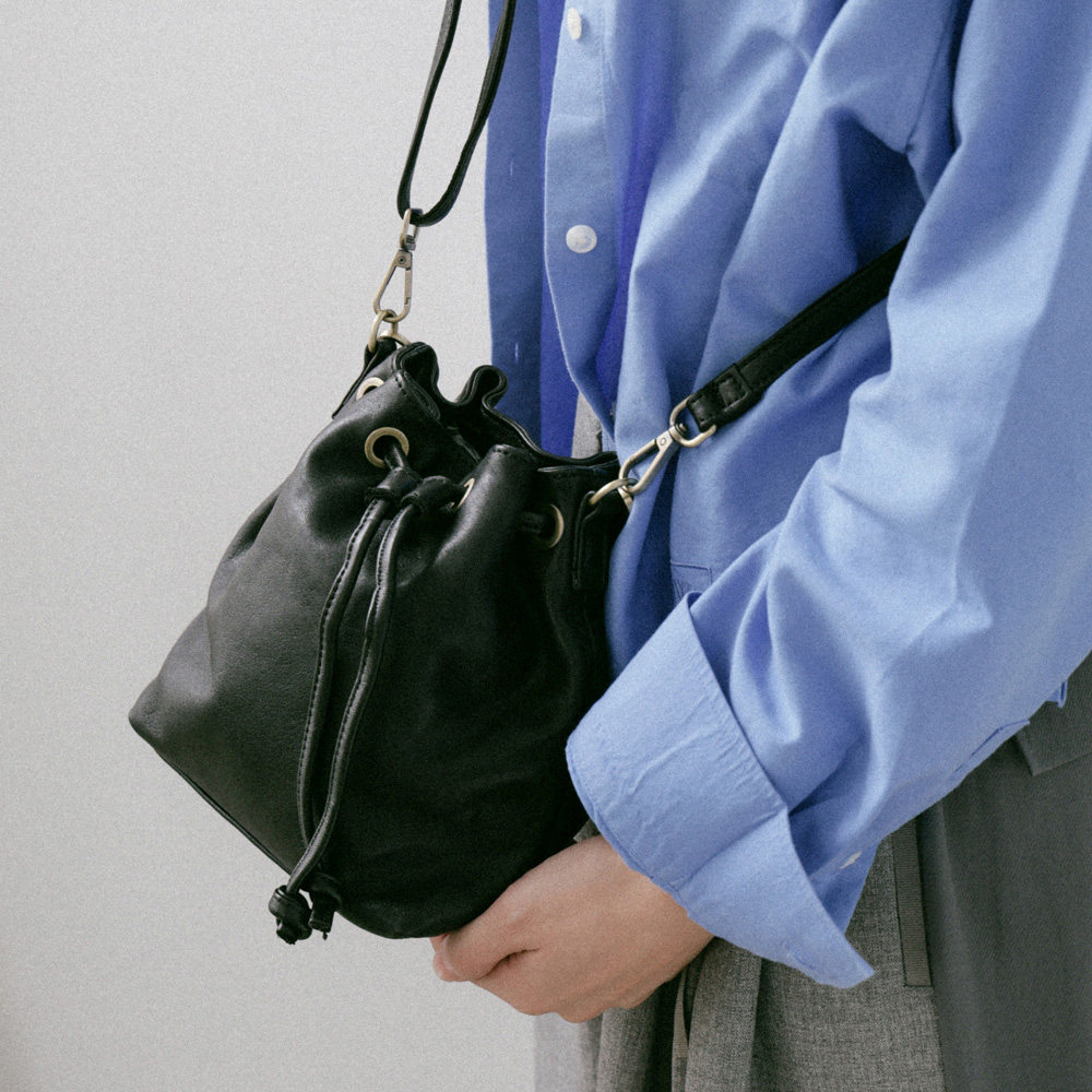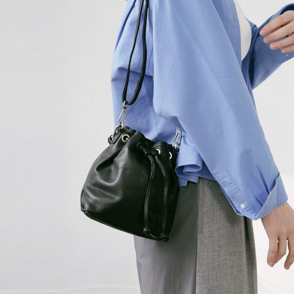 supportingrole 簡約設計風格真皮繩結褶皺水桶包 黑