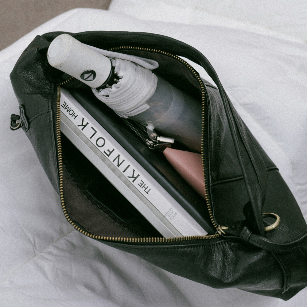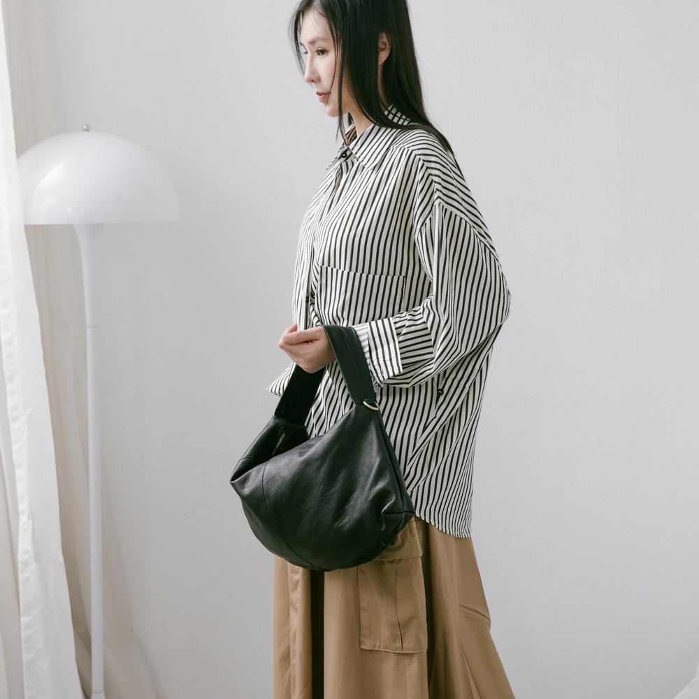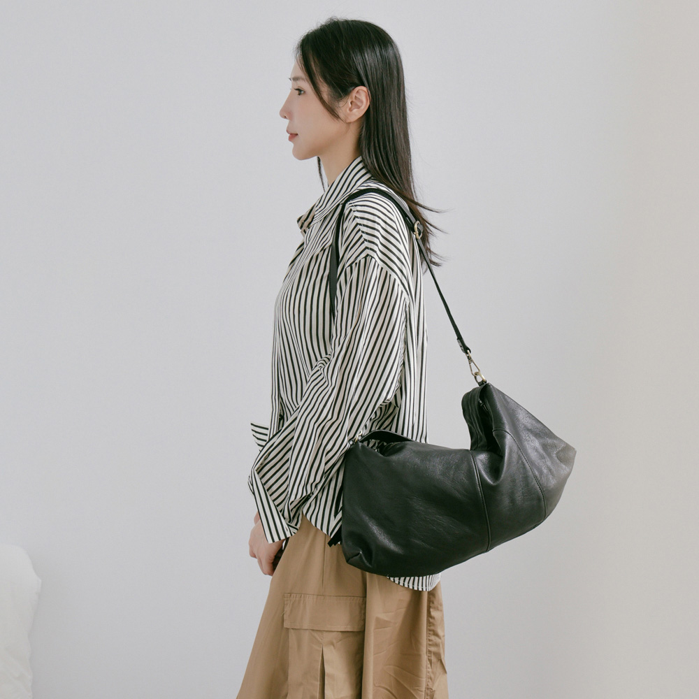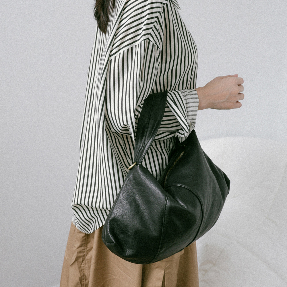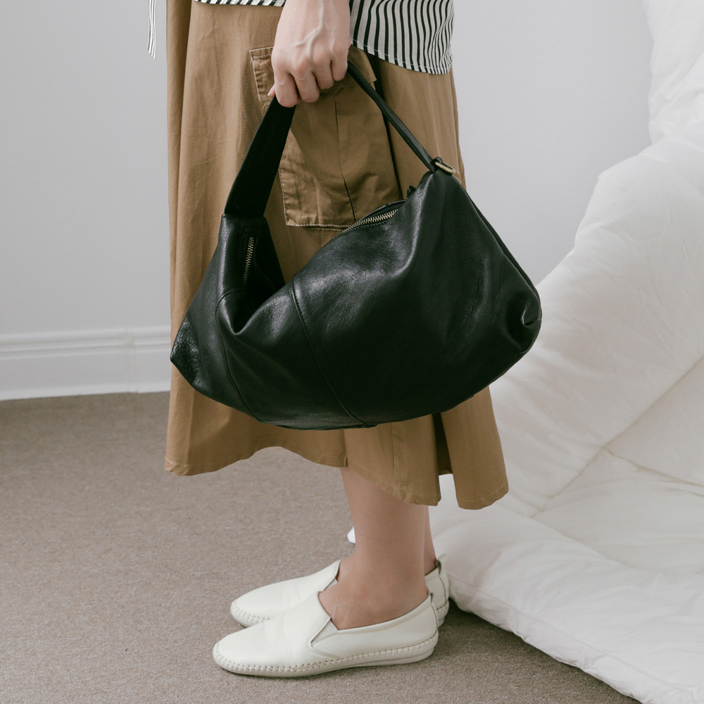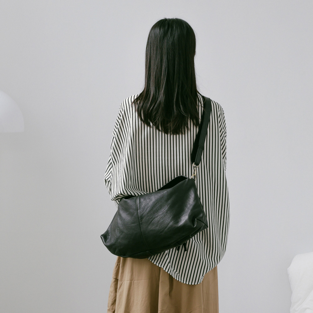 supportingrole 立體收摺廓形優雅慵懶輕量真皮肩斜背手提包 黑