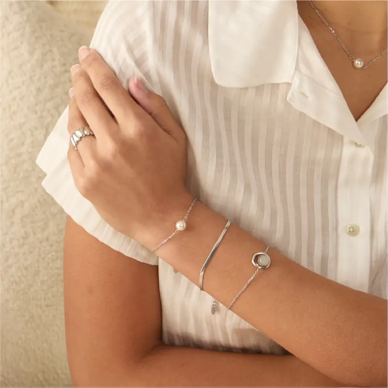 珍珠的溫潤光芒與精緻的金屬鏈條交織出低調雋永美學。