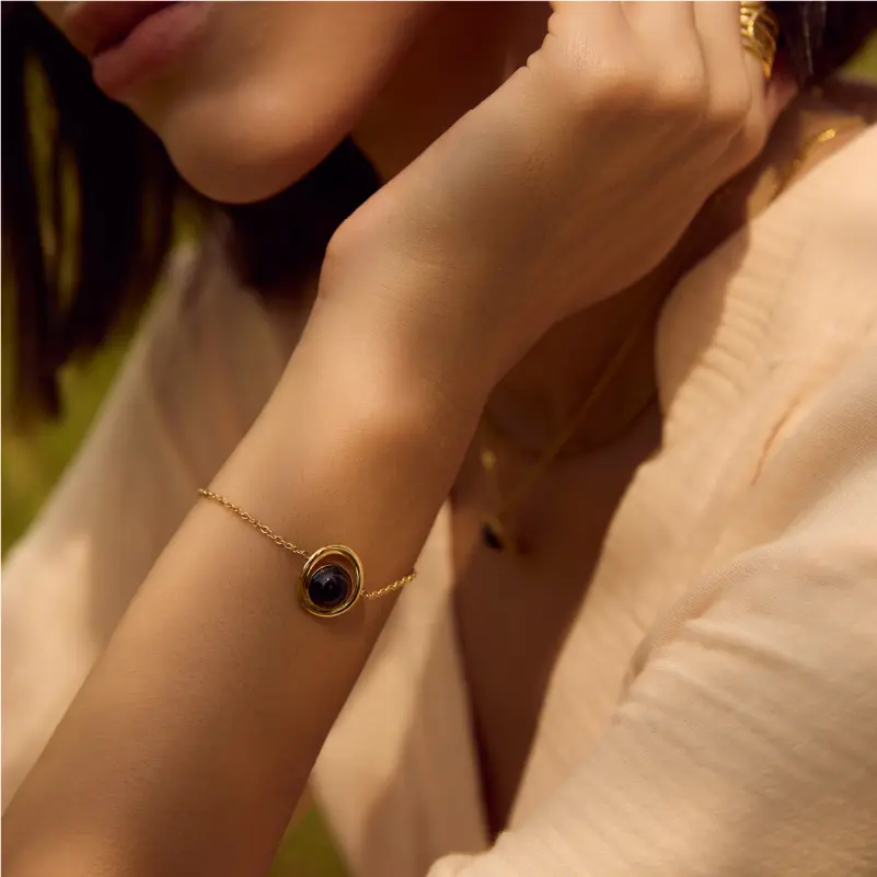 黑曜石象徵勇氣與力量,是激發內在勇氣的精神寄託,優雅鑲嵌於金色底座,搭配耐用時尚的316L不銹鋼鏈條。