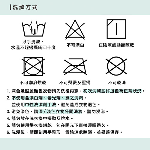洗滌說明:請避免使用含有漂白溶劑的洗劑。