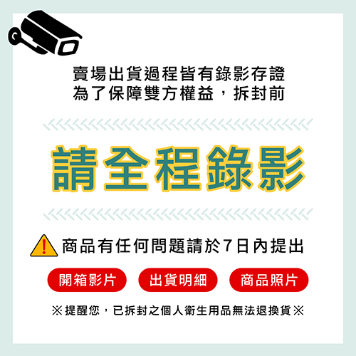 為保障您的權益,請於收到物品後儘速錄影開箱檢視是否正確與完整,若有任何問題請立即與客服人員聯繫。