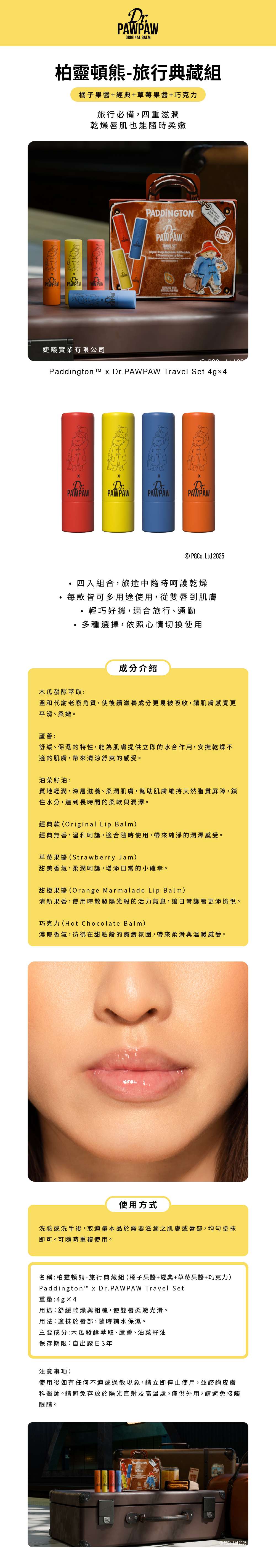 ![Dr.PAWPAW 柏靈頓熊-旅行典藏組4g×4 [甜橙果醬+經典+草莓果醬+巧克力] (英國木瓜霜/護唇膏/萬用霜/Paddington)](https://d2natqlvzq9fp5.cloudfront.net/App_Images/738/ChannelProduct/2026/0130/s_9a9d188c-cce3-4b95-8f3c-f0a1aaff388f.jpg.webp)