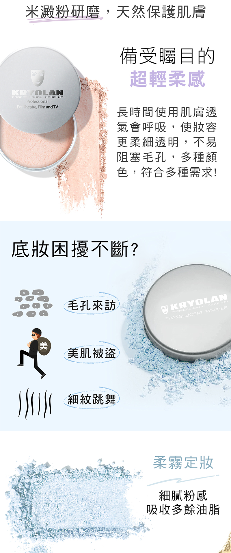 米澱粉研磨,天然保護肌膚,倍受矚目的超輕柔觸感 細嫩的質地,穩定持久定妝力及油脂吸附力是大受青睞的主因,給予肌膚透明無瑕的亮麗,膚質變得細嫩柔滑,是維持超乎想像的完美底妝。