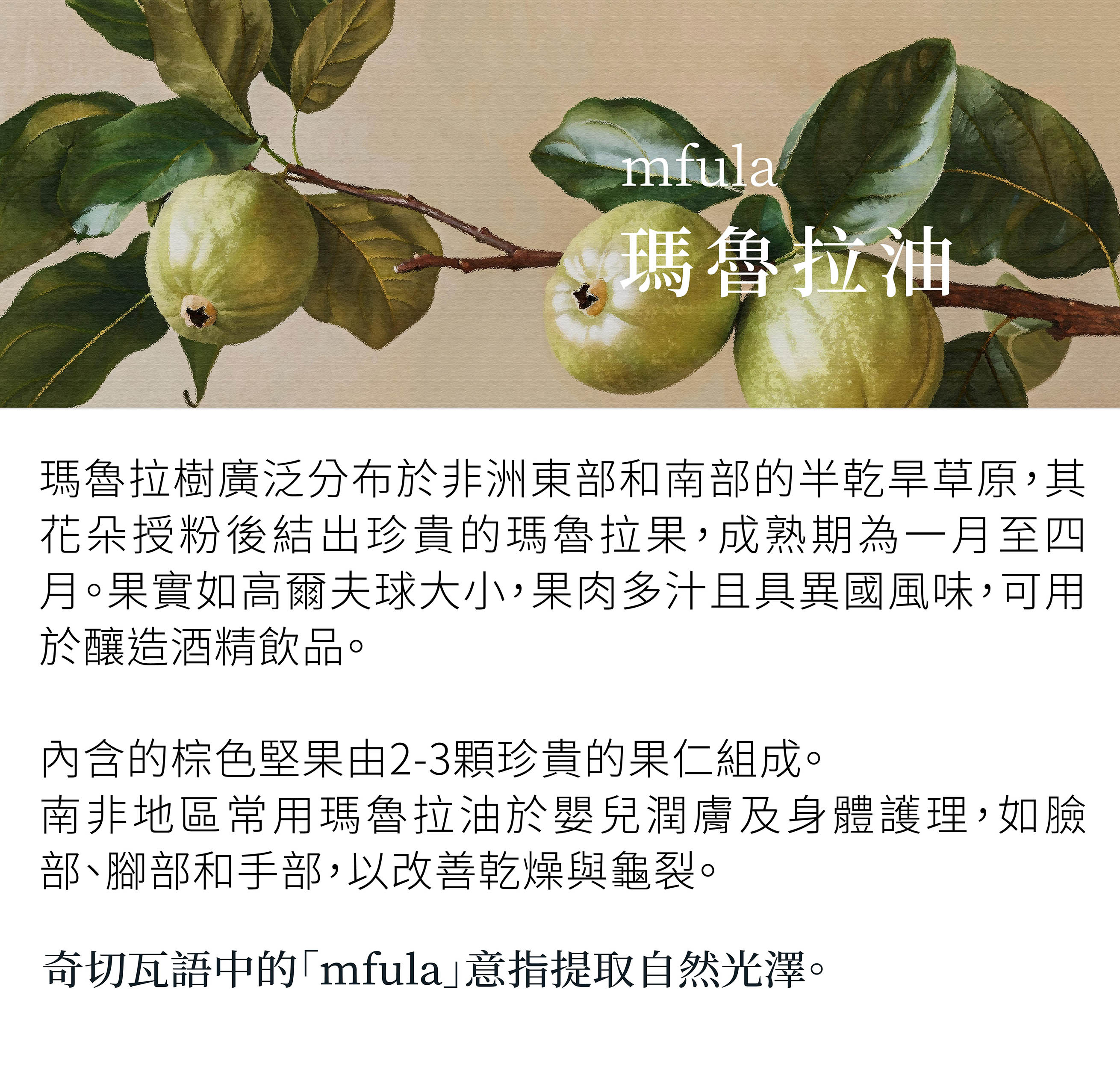 • 添加天然瑪魯拉油,不含蜂蠟、精油及香料。