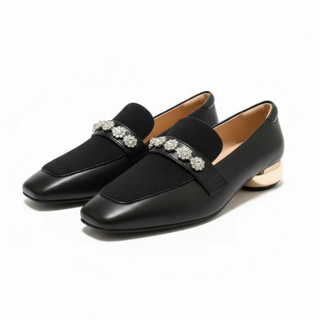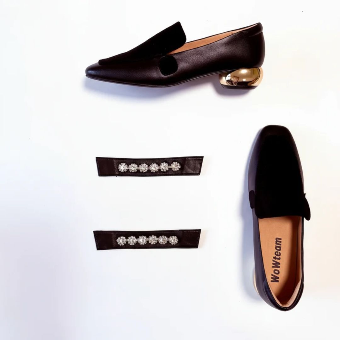 黑色鞋身是低調舞台,星鑽飾帶的璀璨如夜空繁星,金色馬卡龍跟則如流光般閃耀。